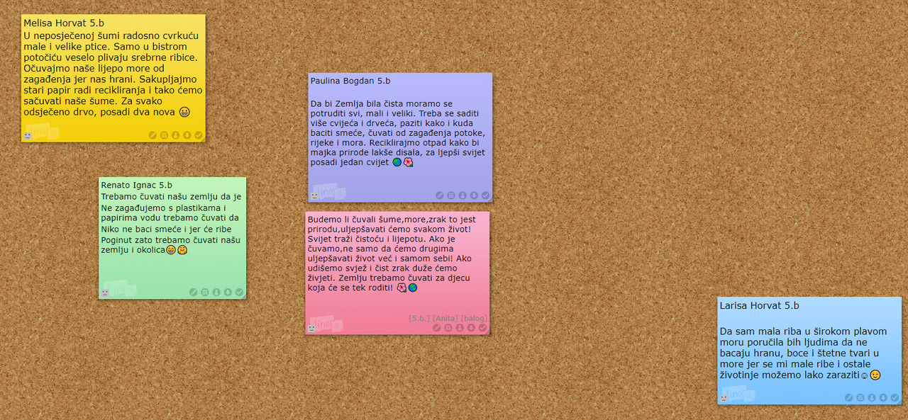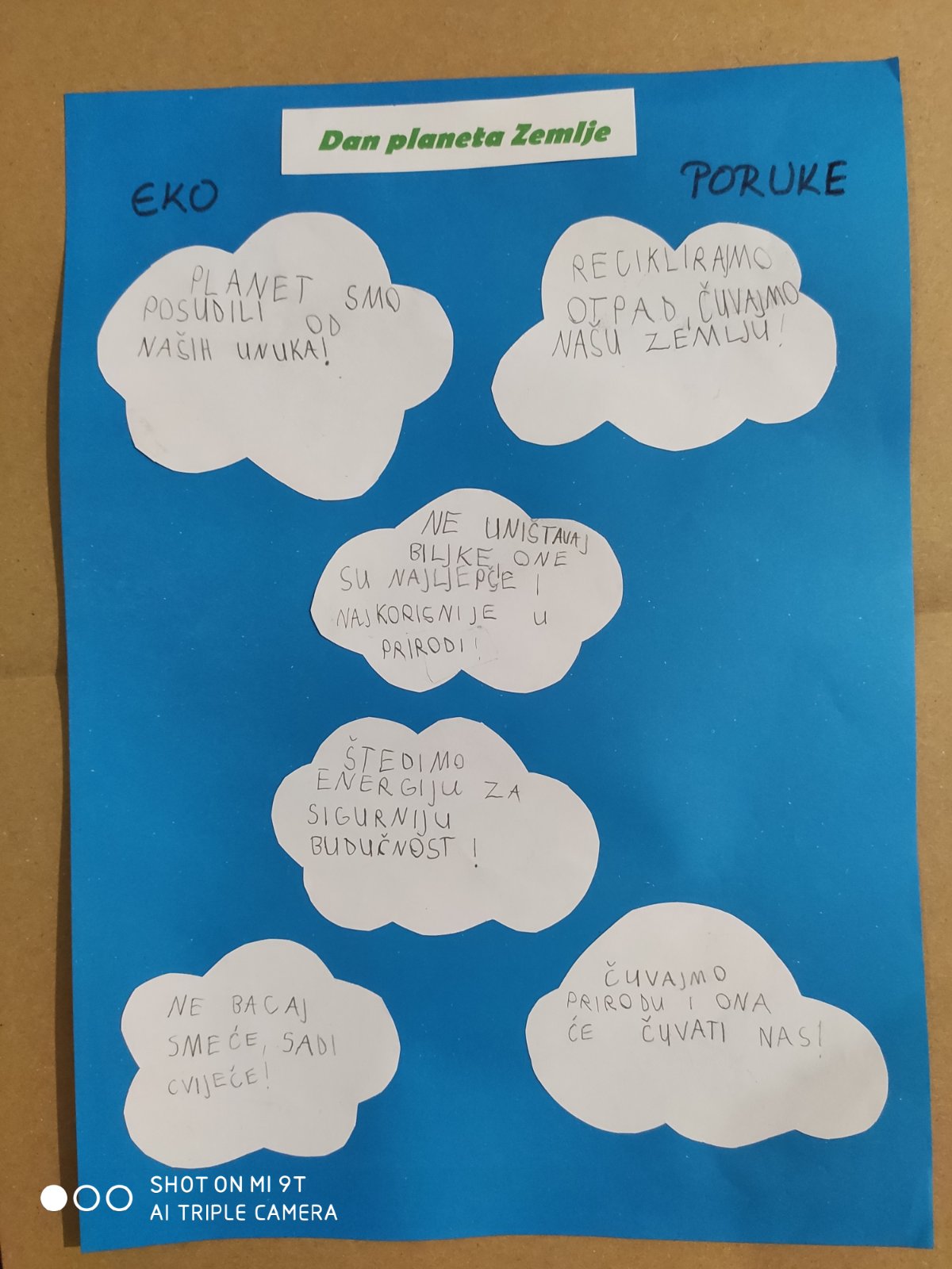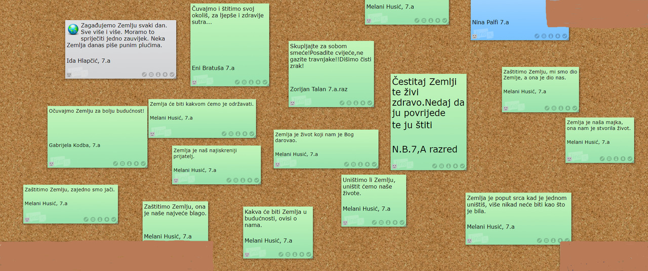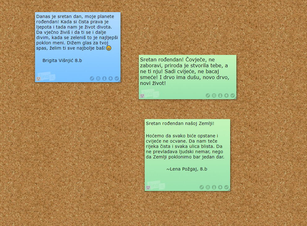 Učenici predmetne nastave čestitali su rođendan našoj Zemlji! Svoje su čestitke i ekološke poruke za Dan planeta Zemlje napisali i stavili na virtualni pano. Možete ih pročitati u galeriji slika, zajedno s preostalim radovima naših učenika!