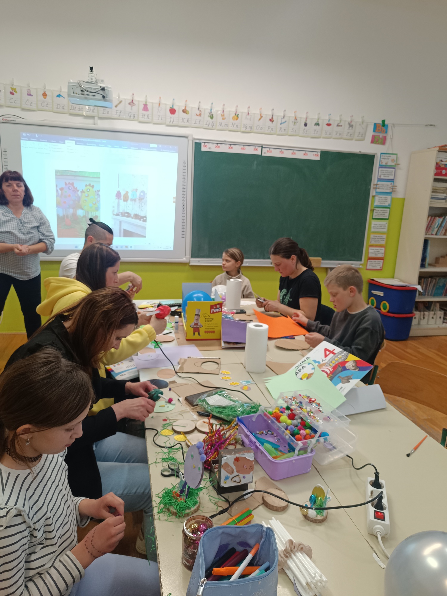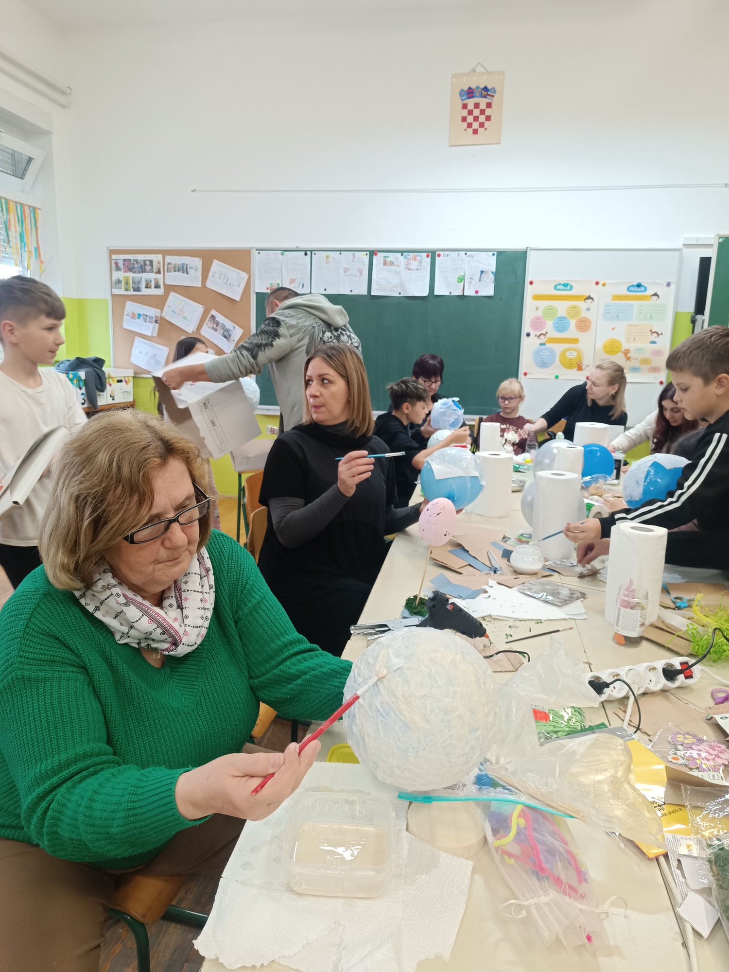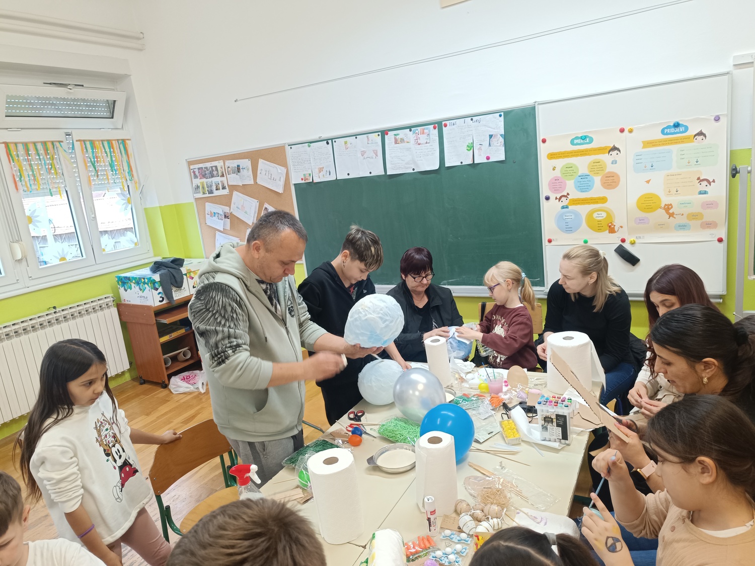 U veseloj i kreativnoj atmosferi spretne ruke roditelja, baka i učenika izradile su koke i piliće od kartona i kaširanog papira balona.