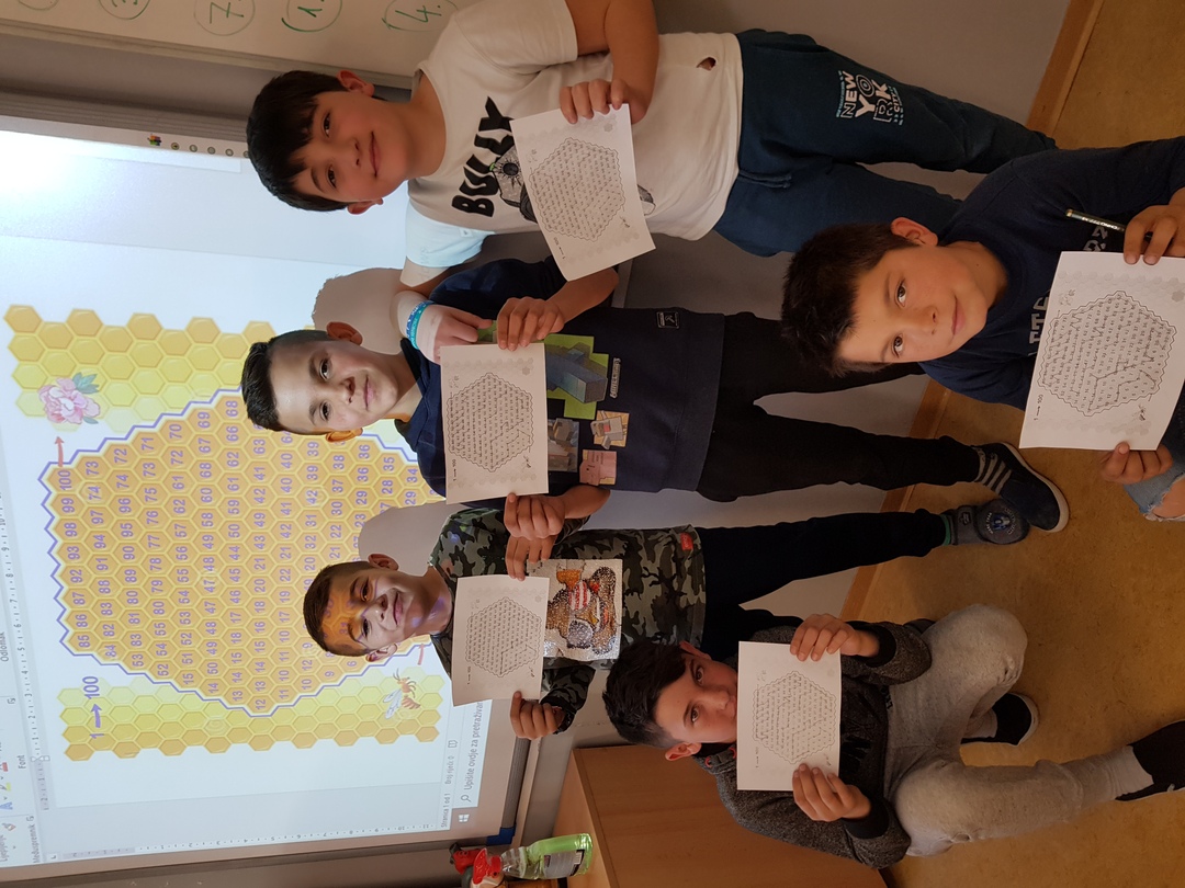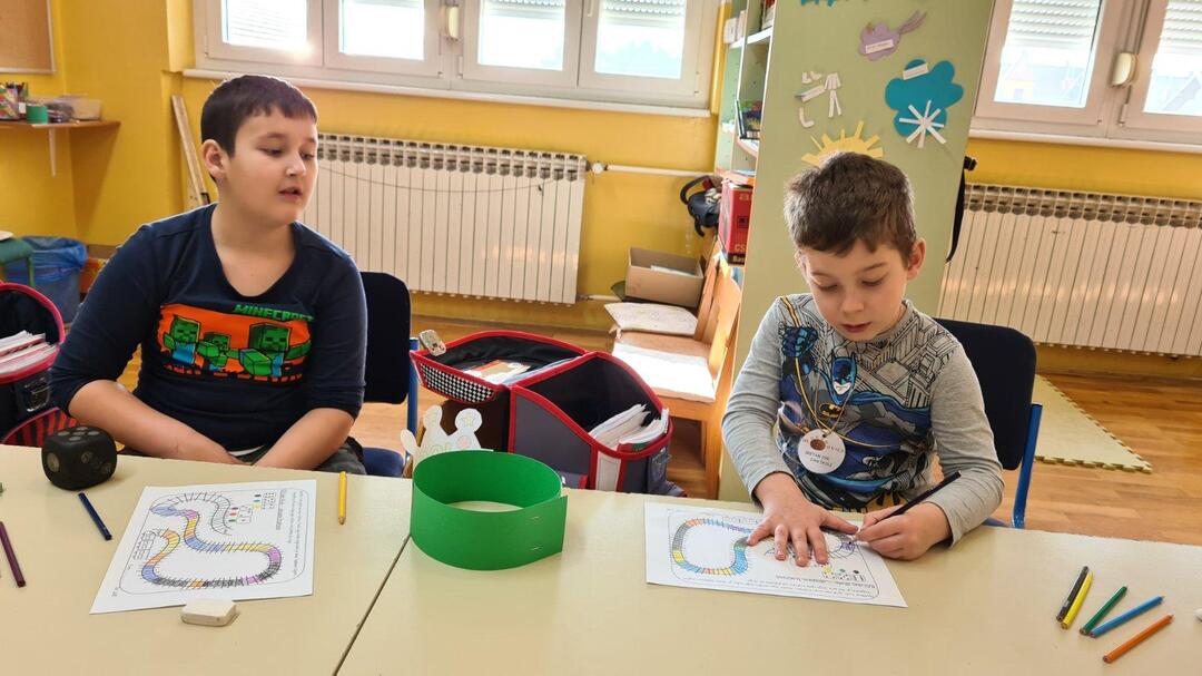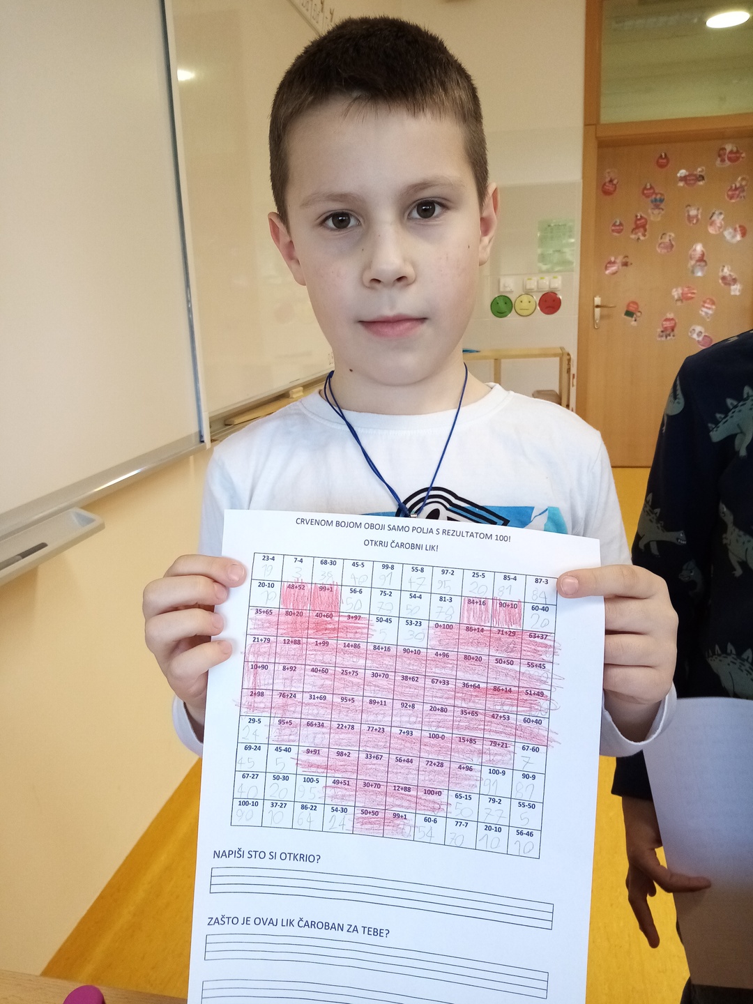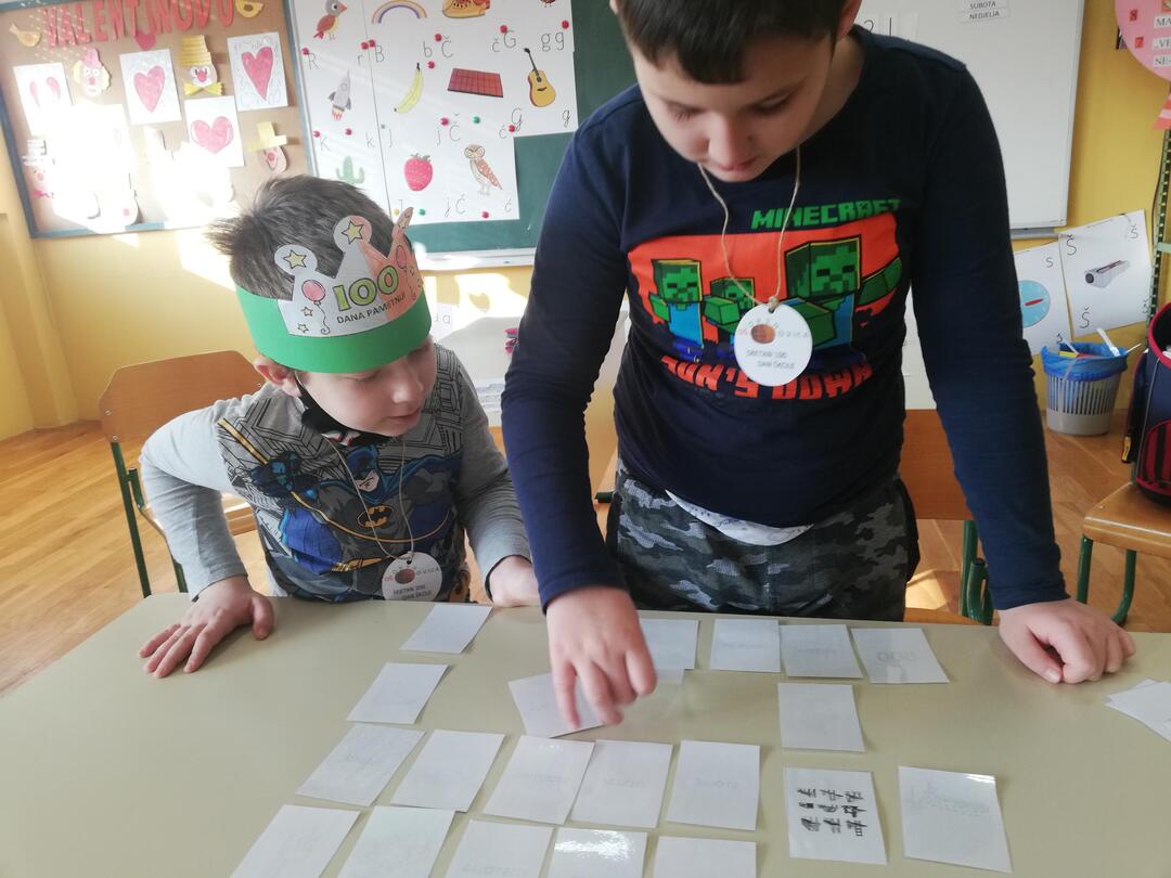 Učenici prvog razreda slušajući upute crtali su čudovište sa stotinu različitih dijelova tijela. Nakon toga bacajući kocku putovali su tračnicama do cilja, do broja 100, rješavali osmosmjerke, igrali memori s riječima i sličicama koje u svom nazivu imaju riječ sto, pisali svoje ime u 100 sekundi.