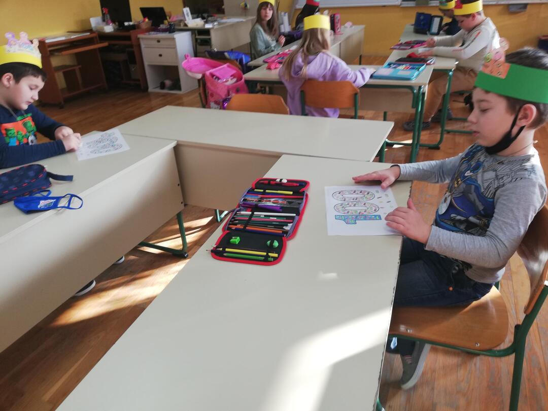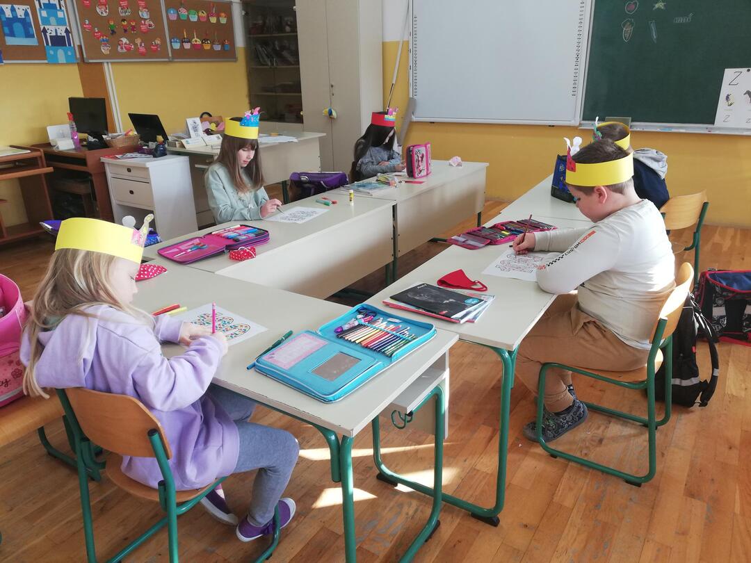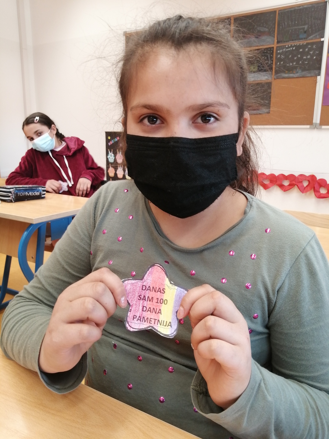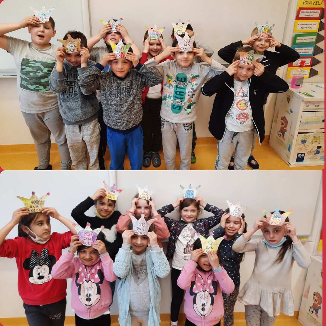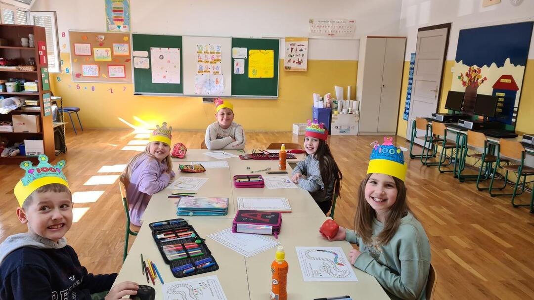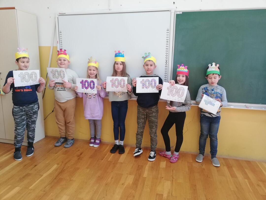 Kroz digitalnu igru „Štrumpfastična zabava“ zajedničkim smo snagama oslobodili zarobljene Štrumpfove i otkrili da pripremaju zabavu za 100. dan škole. Jako smo se začudili što je već prošlo toliko dana nastave. Zatim smo brojeći po 5 (oni koji znaju) podigli u zrak 100 prstiju. Slijedio je izazov „Možeš li napisati 100 riječi?“ koji traje do kraja tjedna. Najviše točnih riječi napisala je i pobijedila naša Rea. Nakon toga obojali smo si i izrezali krune za 100. dan škole. I na kraju smo od učiteljice dobili bedževe s natpisom „100. Dan škole“ za uspomenu na ovaj veseli dan.