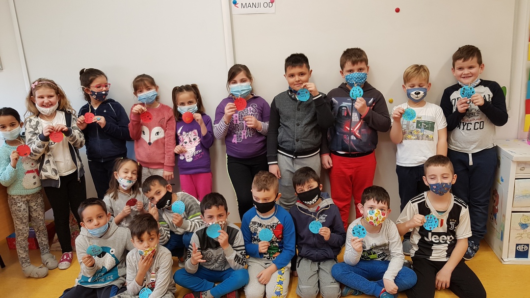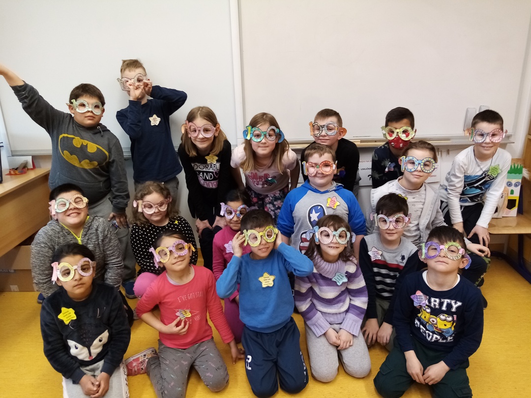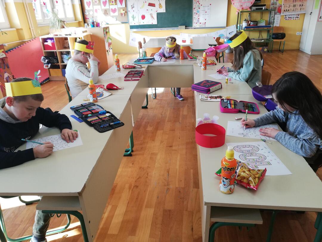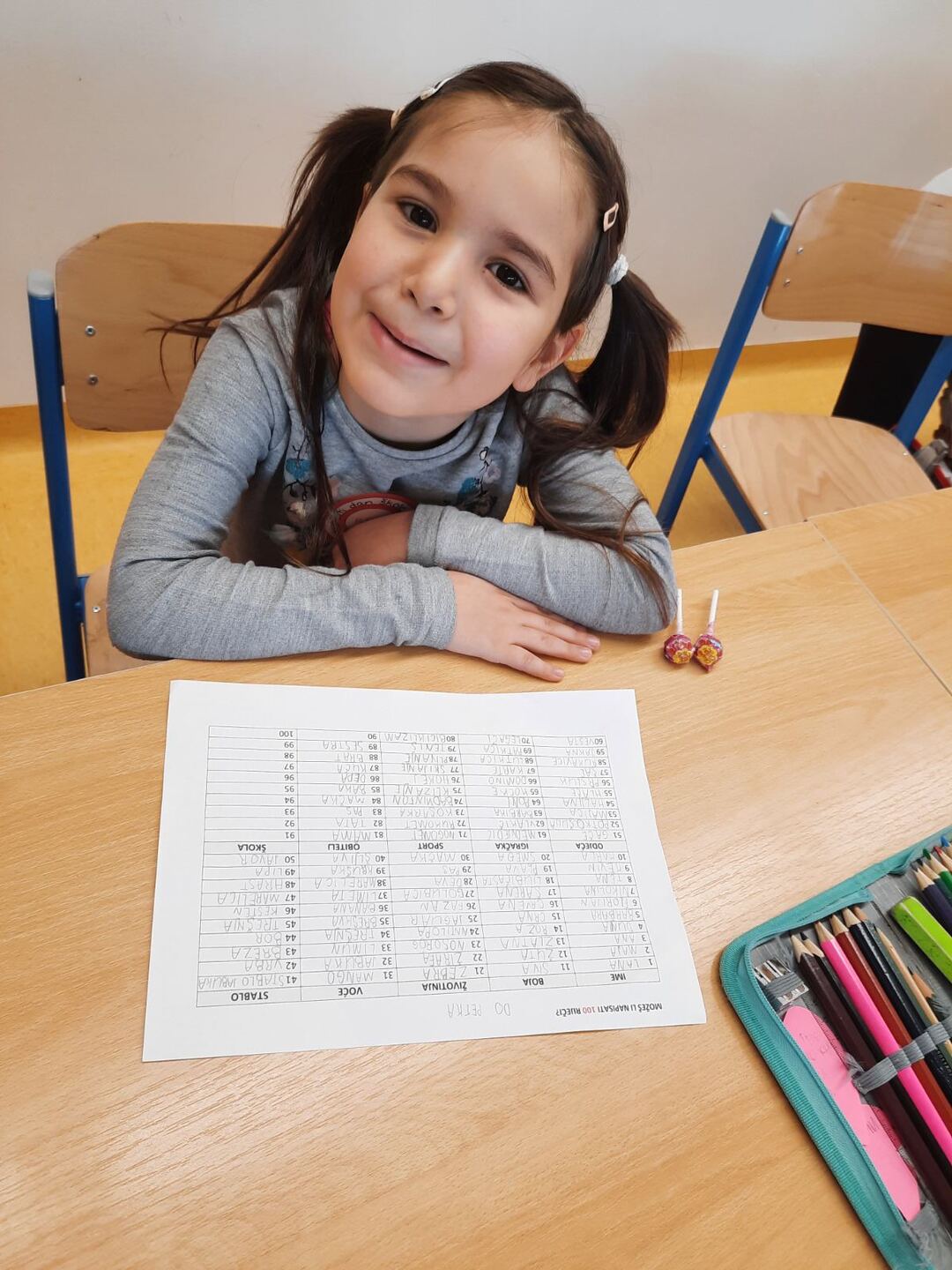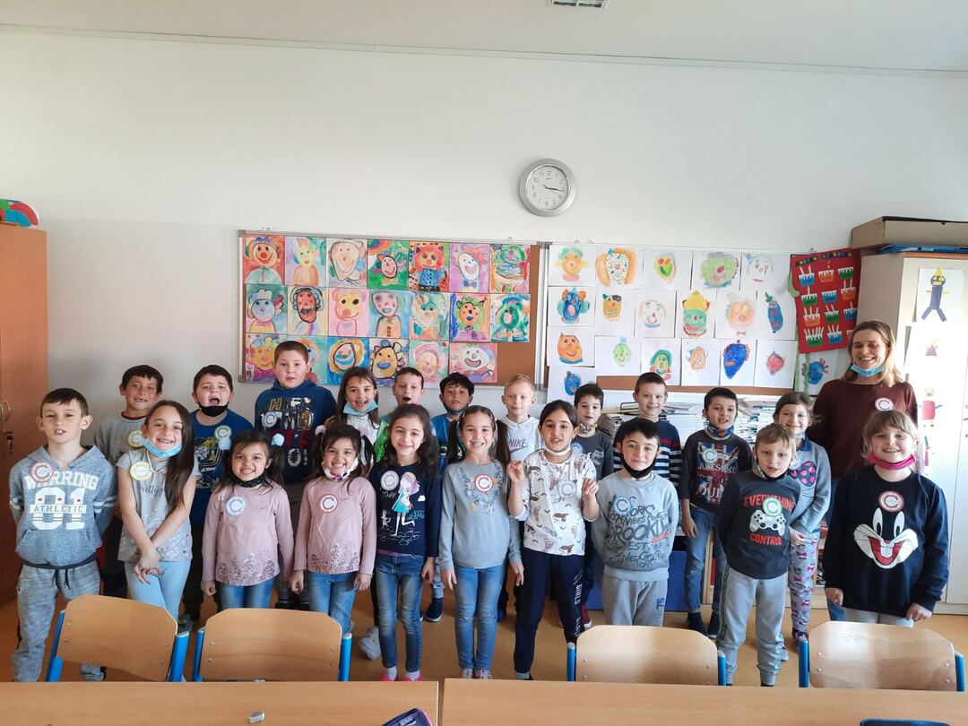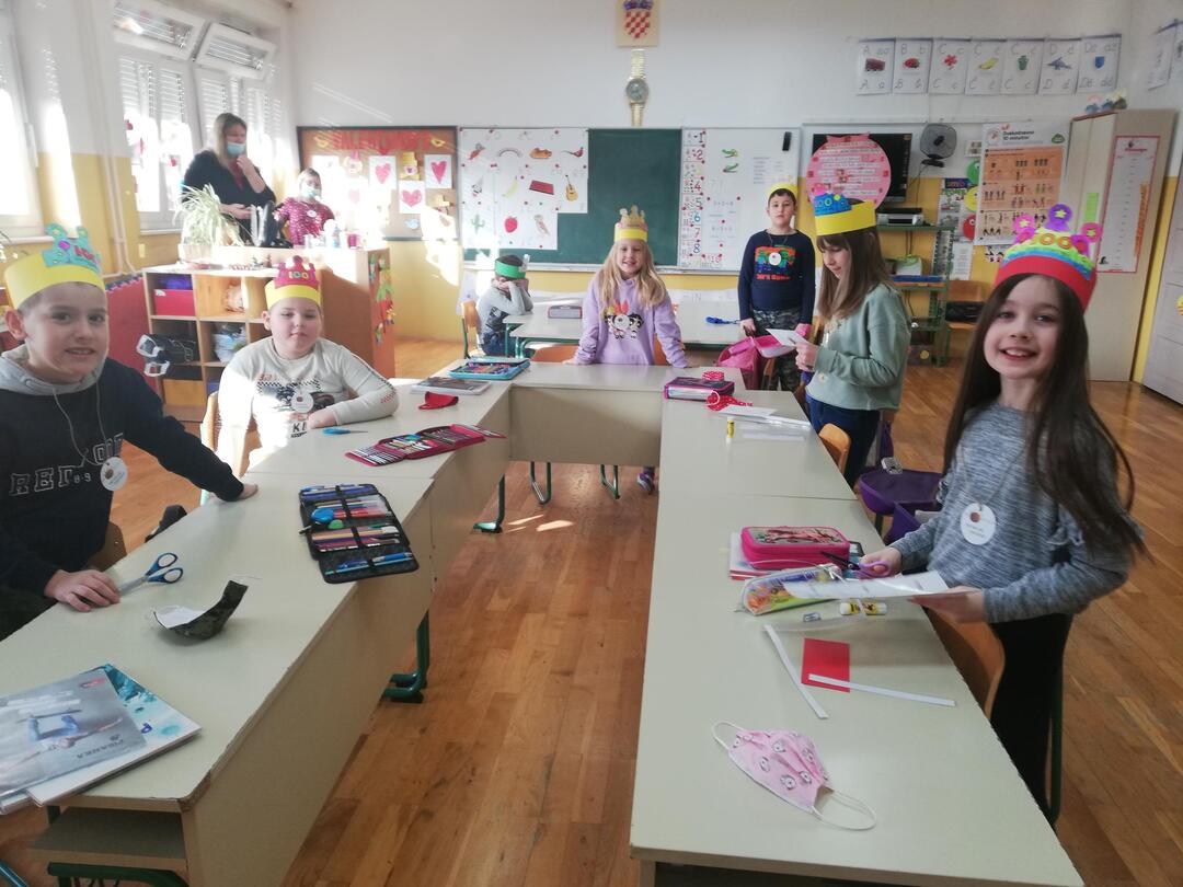Kroz digitalnu igru „Štrumpfastična zabava“ zajedničkim smo snagama oslobodili zarobljene Štrumpfove i otkrili da pripremaju zabavu za 100. dan škole. Jako smo se začudili što je već prošlo toliko dana nastave. Zatim smo brojeći po 5 (oni koji znaju) podigli u zrak 100 prstiju. Slijedio je izazov „Možeš li napisati 100 riječi?“ koji traje do kraja tjedna. Najviše točnih riječi napisala je i pobijedila naša Rea. Nakon toga obojali smo si i izrezali krune za 100. dan škole. I na kraju smo od učiteljice dobili bedževe s natpisom „100. Dan škole“ za uspomenu na ovaj veseli dan.