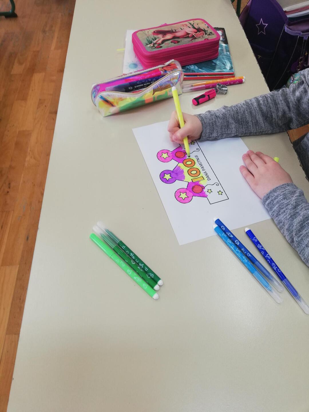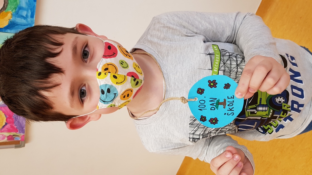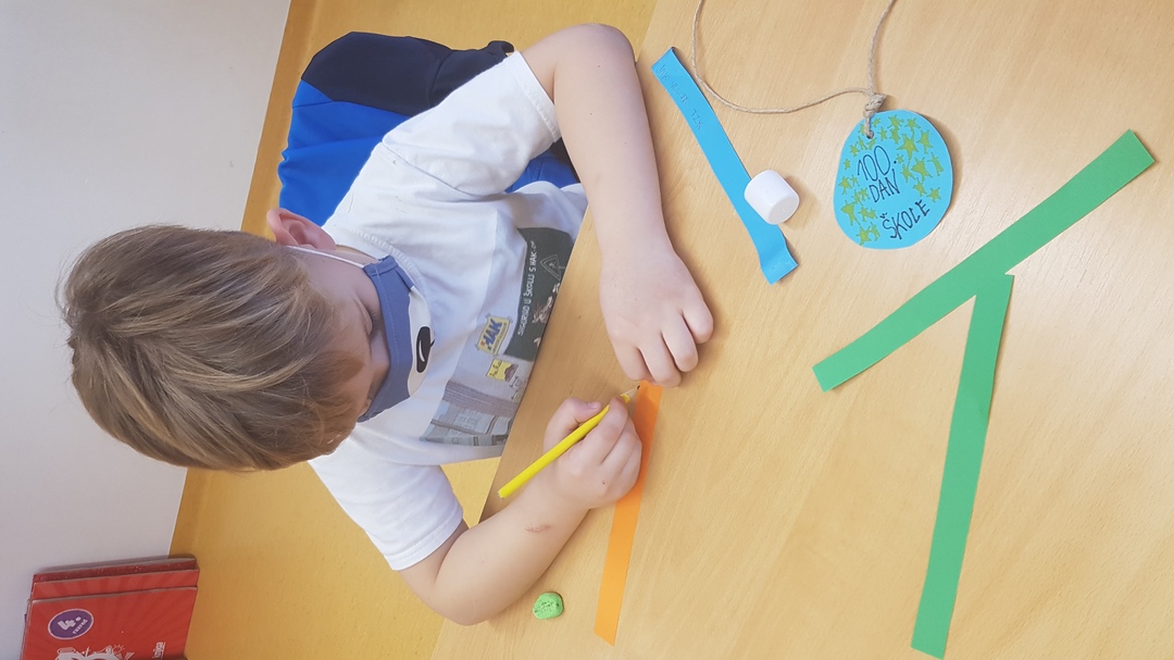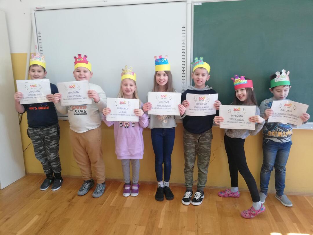 Učenici 1. a razreda prvo su radili "nakit" s privjeskom "100. dan škole". Zatim smo radili lanac sa 100 pozitivnih misli, emocija, događaja koji su im se dogodili u ovih sto dana škole. Na kraju je svaki učenik dobio pohvalnicu od učiteljice kao nagradu za dosadašnji rad, ali i kao poticaj za daljnji rad.