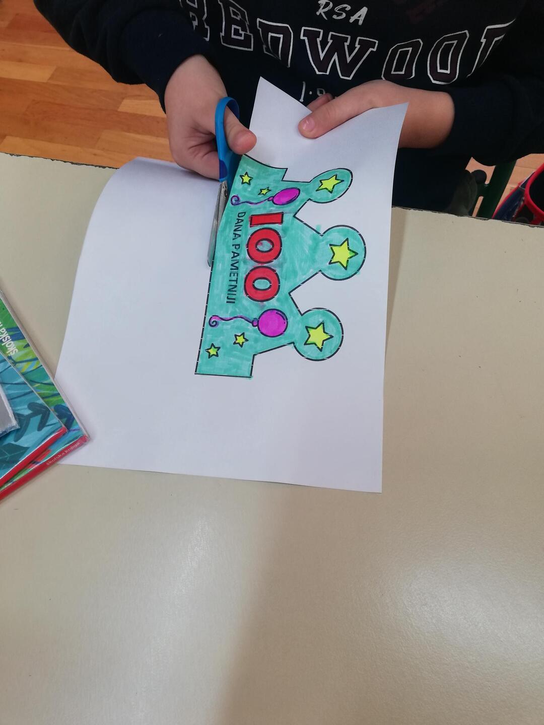 Danas smo u 1.c/2.c obilježili 100. dan škole. Na vratima nas je dočekao natpis za sretan stoti dan. Učiteljica nam je složila medalje s natpisom stotog dana. Prva aktivnost bila nam je izrada krune. Svi smo se jako potrudili bojati i izrezivati krunu. Ponosno smo je stavili na glavu. Zatim smo tražili sto različitih sličica u broju 100.