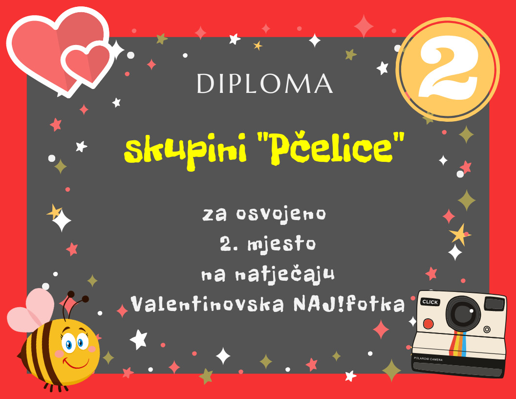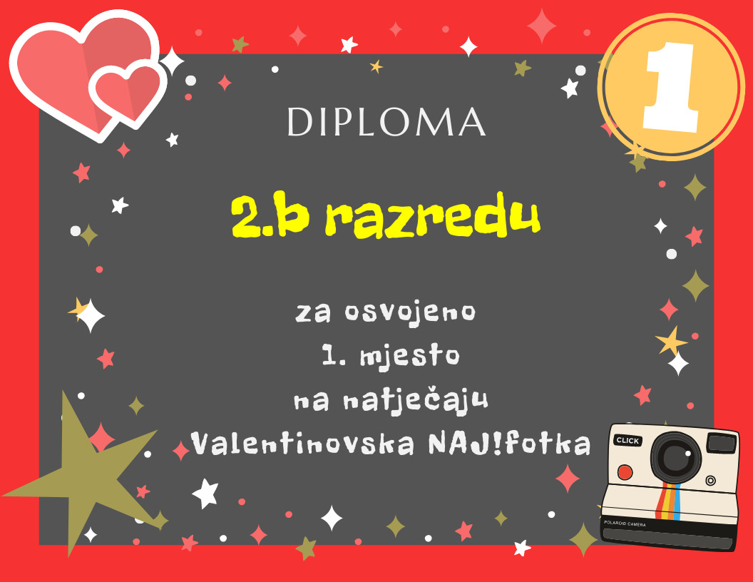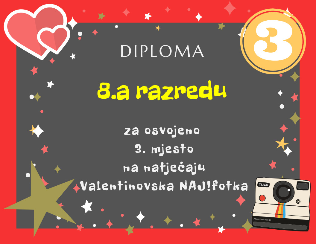 Organizirali smo natječaj za najbolju valentinovsku fotografiju razreda. Žiri je imao težak zadatak. Sve pristigle fotografije su odlične, no neke se ipak ističu. Tri najbolje fotografije nagrađene su diplomama i ''slatkim'' paketima. Pogledajte!