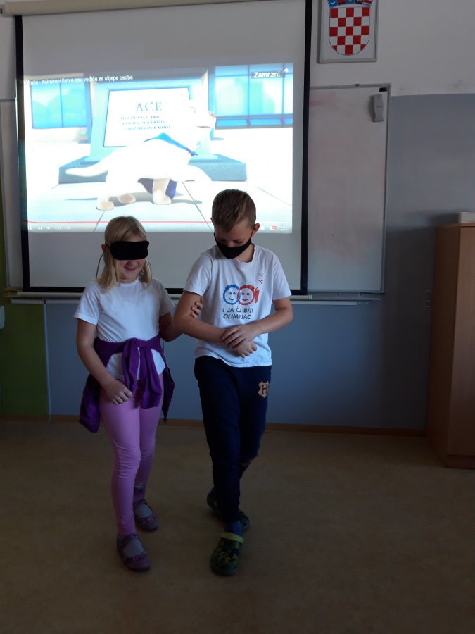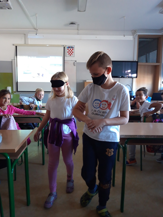 Kako bismo pokušali razumjeti kako se slijepe osobe osjećaju u nekom prostoru, ali i da bismo uvježbali na koji način pomažemo slijepim osobama, vezali smo oči i pokušali voditi jedni druge do određenog cilja. Zavezanih očiju, dodirom smo pokušavali otkriti koji predmet se nalazi pred nama i što nam netko „piše“ prstom po leđima.