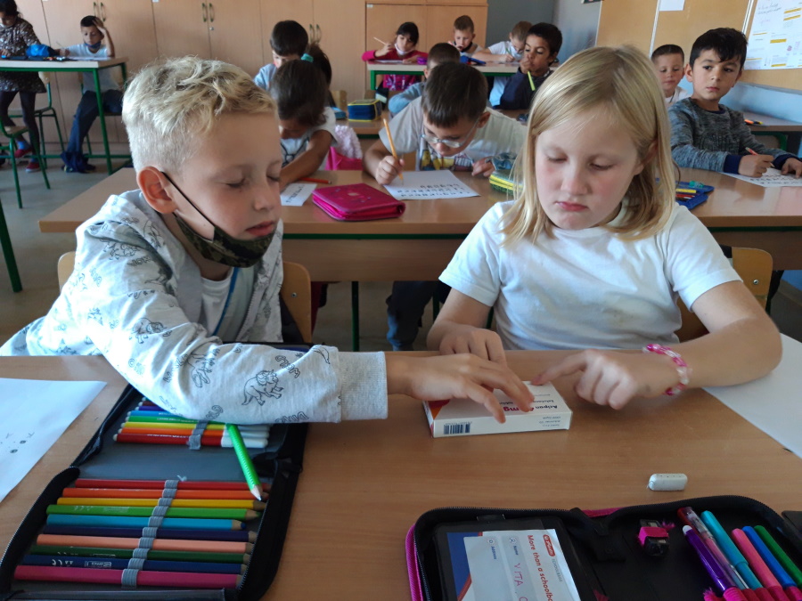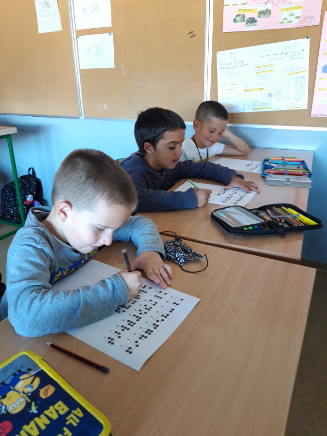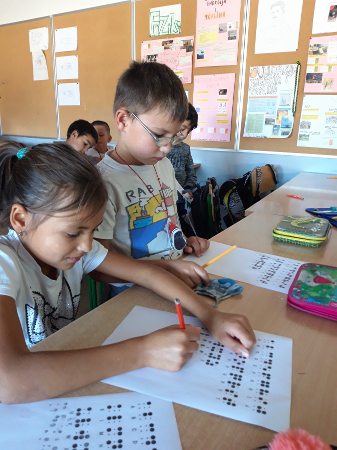 Učiteljica nam je donijela nekoliko kutijica lijekova gdje smo opipali pismo za slijepe, a nakon toga podijelila nam je listove s Brailleovom abecedom pa smo i sami pokušali napisati svoja imena. Bilo nam je jako zanimljivo i poučno!