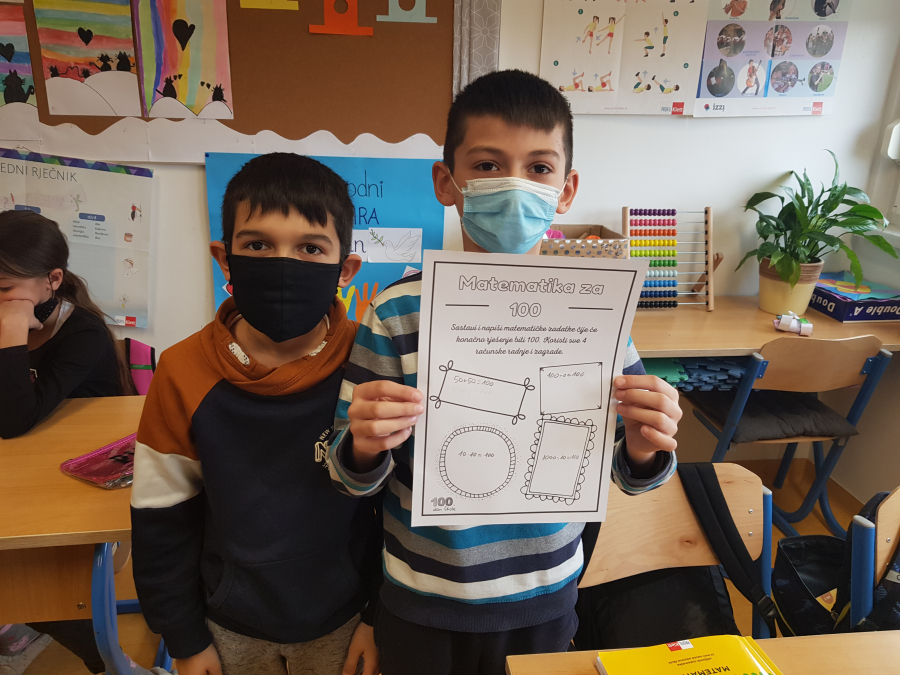 Iz matematike smo učili kako višekratnik broja 10 dijeliti s 10 i višekratnik broja 100 sa 100. Nije nam bilo teško! Za kraj smo sastavili i napisali matematičke zadatke čije je konačno rješenje 100.