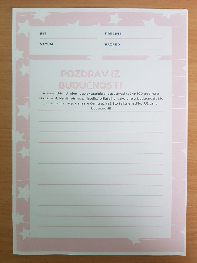 Zatim smo zamislili da smo vremenskim strojem otputovali 100 godina u budućnost. Napisali smo kratki sastavak „Pozdrav iz budućnosti“ u kojem smo javili kako nam je u budućnosti, što je drugačije nego danas, u čemu uživamo, što nas je iznenadilo i sl. Barem u mislima, uživali smo u 2122. godini.