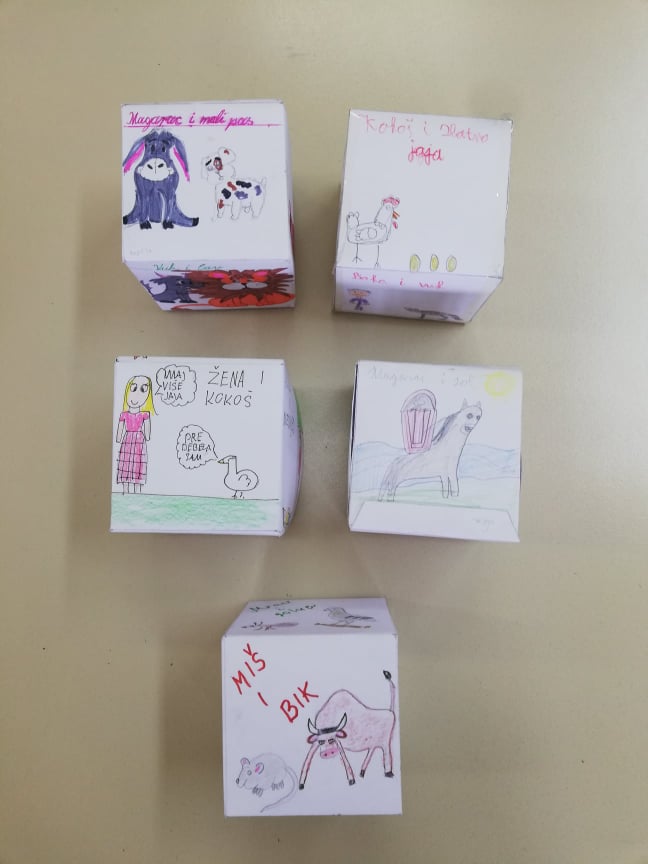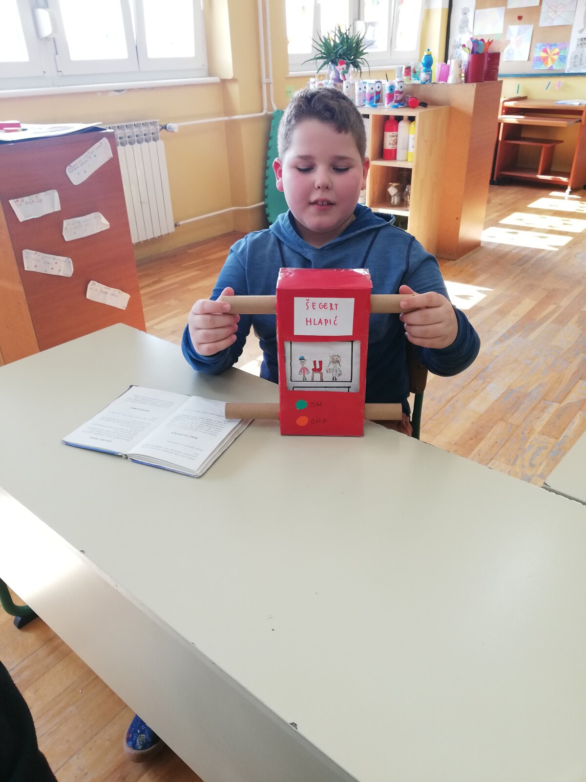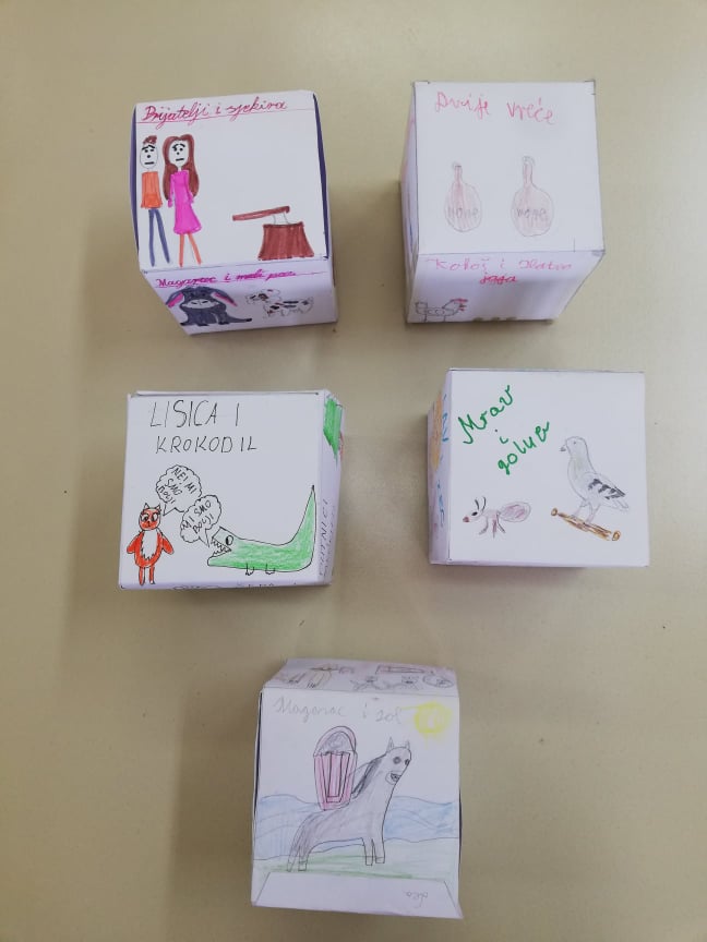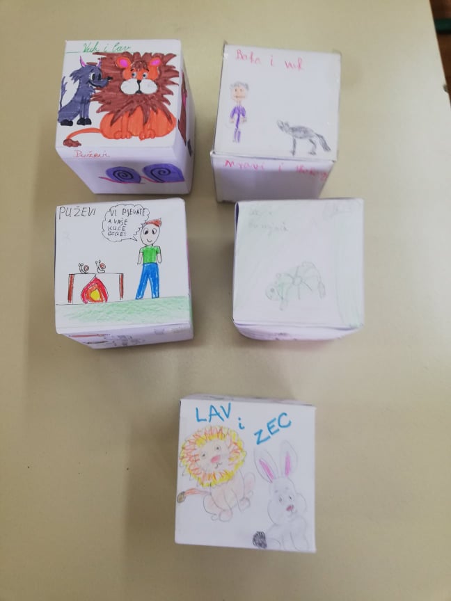 Kockama pričalicama učenici 3.c prepričali su Ezopove basne i naučili koje su dobre, a koje loše osobine ljudi prikazane kroz životinjske likove. Zadatak je bio na svaku stranu kocke napisati naslov odabrane basne, ilustrirati je i znati pouku te basne. Bacanjem kocke određena je basna koju su interpretirali. Zadatak za lektiru Čudnovate zgode šegrta Hlapića u 3.c bio je izrada televizora i crtanje događaja koji prate slijed radnje u romanu. Svi učenici jako su se potrudili i interpretirali na svom televizoru sve važne događaje i likove koji prate Hlapića na njegovom putovanju.