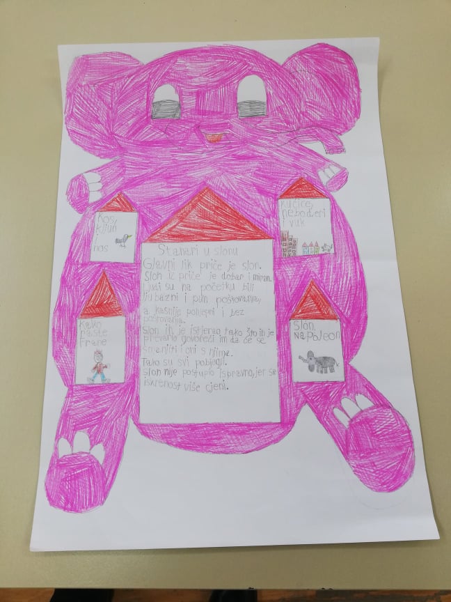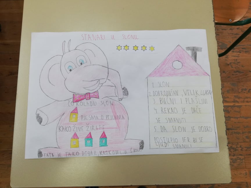 Učenici 2.c imali su zadatak nacrtati velikog slona i u njemu smjestiti različite stanare (odnosno naslove odabranih priča i pjesama, te detaljnije napisati odgovore na pitanja o priči Stanari u slonu). Tako smo saznali da su stanari iskorištavali dobrotu slona sve dok ih on svojom lukavštinom nije izbacio iz sebe i pobjegao daleko.