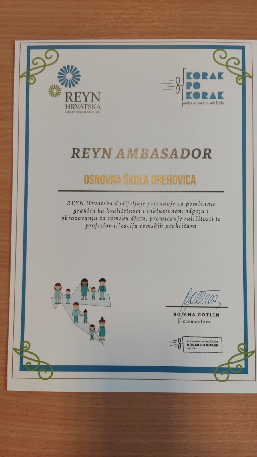 Sam Reyn objasnio je zašto je izbor bila upravo učiteljica Natalija Sklepić i OŠ Orehovica. Natalija Sklepić ovogodišnja je dobitnica priznanja REYN Ambasador. Natalija je vrlo vjerojatno prva romska učiteljica, sigurno je kompetentna učiteljica, Korakova praktičarka i romska aktivistkinja. Radila je u nizu škola u Međimurju, a trenutačno radi u OŠ Podturen i OŠ Orehovica gdje predaje Jezik i kulturu romske nacionalne manjine. Sudjelovala je i u izradi kurikuluma za obrazovanje djece pripadnika romske nacionalne manjine. Provodi tečaj bajaškog rumunjskog jezika za praktičare koji u Međimurju rade s romskom djecom i njihovim obiteljima. Unatoč višestrukim preprekama u završetku formalnog obrazovanja i pronalasku zaposlenja, Natalija pokazuje koliko su romski profesionalci u sustavu odgoja, obrazovanja i skrbi za romsku djecu potreban kotač promjene i jamac uspjeha u osiguravanju inkluzivnog obrazovanja. Njen uspjeh kao i kvaliteta i posvećenost njenog rada s romskom djecom razlog su zašto je ona naš REYN ambassador.