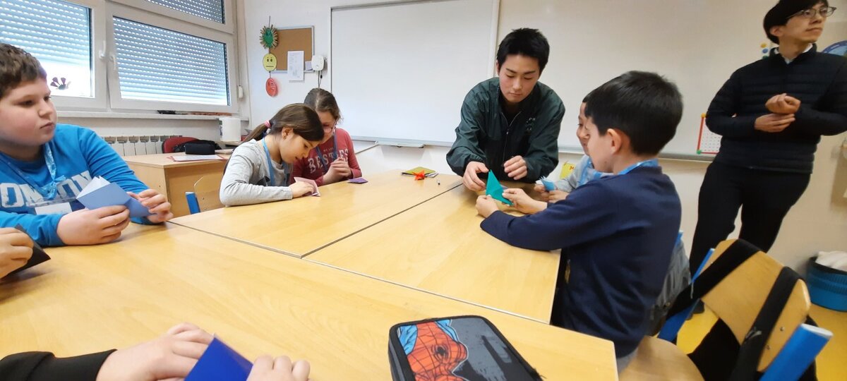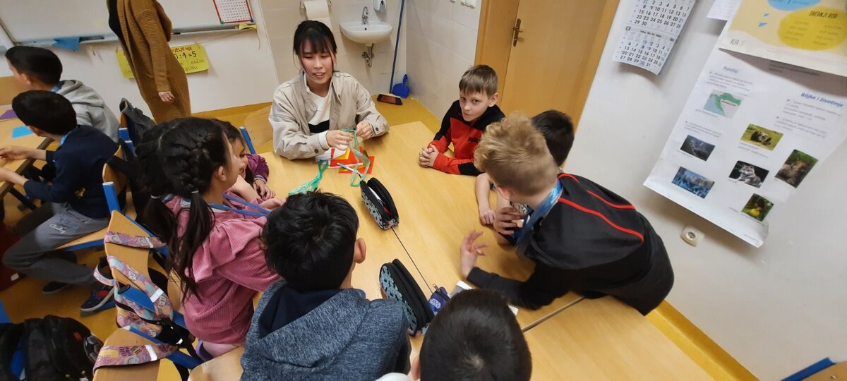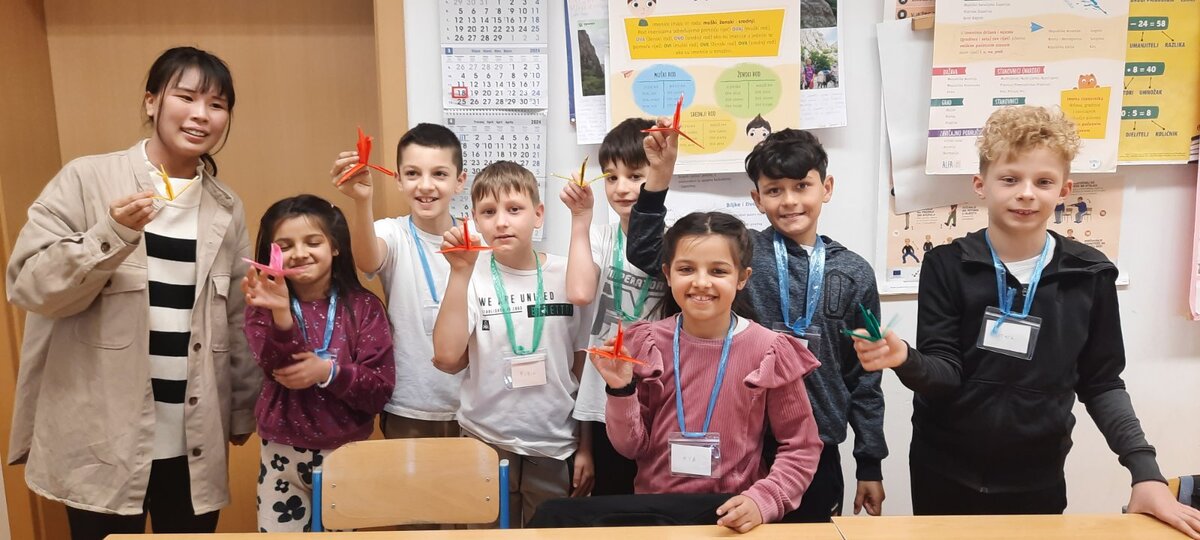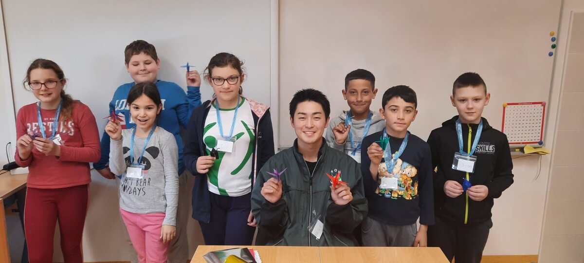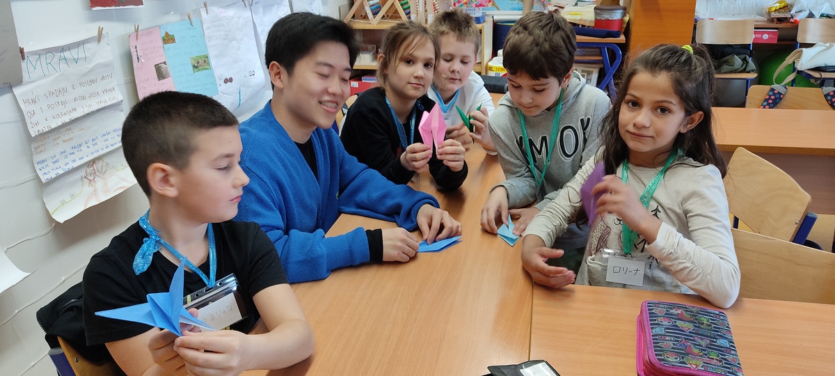 Studenti su jedan školski sat promatrali nastavu, a drugi sat su učenicima pokazali kako se pišu njihova imena na japanskom. Svaki učenik je dobio napisano svoje ime japanskim pismom. Odigrali si i igru "Uhvati zmaja za rep". Učenicima su pokazali kako se izrađuje origami, tradicionalna igra oblikovanja papira te zajedno izradili ždralove. Pokazali su im i neke japanske tradicionalne igračke.