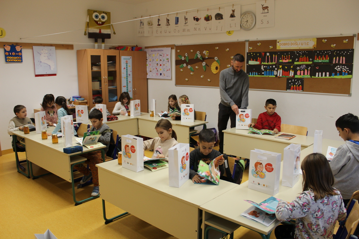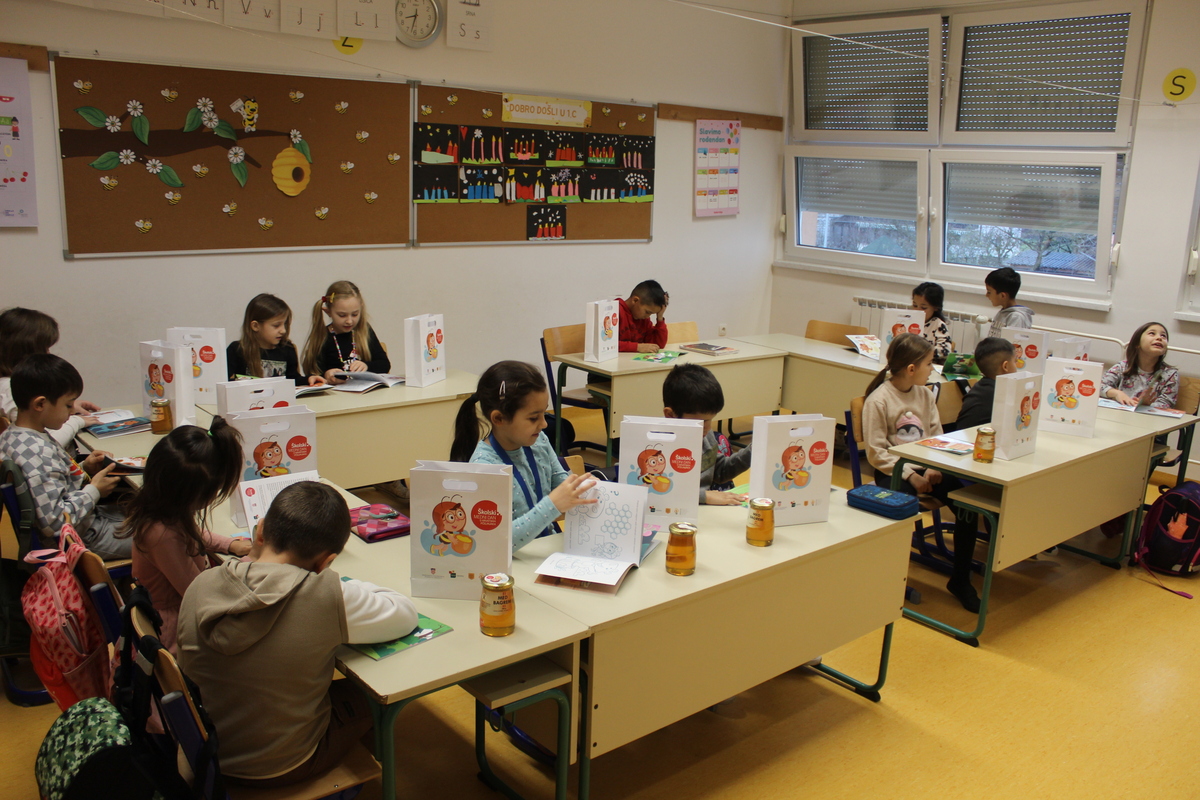 Učenici 1.a, 1.b i 1.c razreda sudjelovali su u kratkom edukativnom programu o važnosti pčela, nastanku meda i vrijednosti domaćih proizvoda. Učenici su s veseljem otvorili svoje promotivne pakete koji sadrže slikovnicu “Pčelica Jelica i medo Edo” te staklenku bagremovog meda s hrvatskih pčelinjaka. Ovaj program doprinosi osvještavanju važnosti očuvanja pčela i prirode te potiče najmlađe na zdrave prehrambene navike.