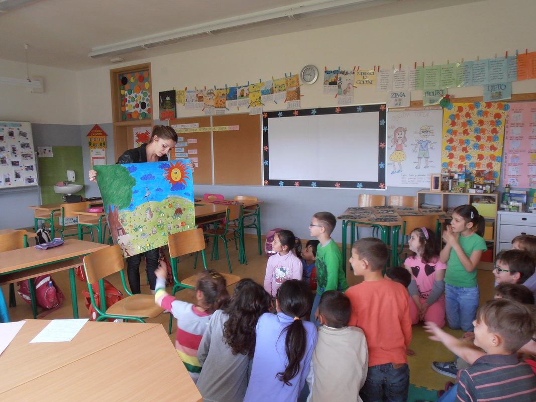Konačno je došao dan koji smo nestrpljivo iščekivali. Stigla je gošća u naš razred. Najprije smo se pozdravili te upoznali s njome. Ispričala nam je kako se rodila njena ljubav prema slikanju, što najradije slika, što je inspirira, ... Objasnila je učenicima kako je naslikala sliku za razredni pano. Zamolila ih je da prošeću svijetom mašte te pokušaju odgonetnuti što se na slici nalazi. Bilo je tu stvarno neobičnih, zanimljivih, iznenađujućih ideja. Zapravo, učenici su vrlo dobro opisali sliku jer su već u prvim sekundama promišljanja odgonetnuli da se radi o temi vezanoj uz proljeće. Zatim je mama Martina, uz pomoć učenika, izradila naslov za pano u šarenim bojama proljeća. Na kraju, ukrasila je naš razredni pano (svojim radom, učeničkim radovima) te u naš razred unijela dašak proljeća. Hvala joj na tome!