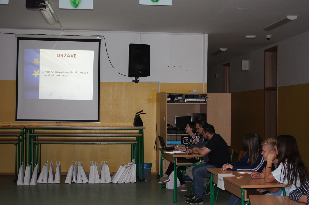 U našoj školi danas je održano finale 16. natjecanja EU-KVIZ za Međimursku županiju kojoj je glavni organizator Informacijski centar EUROPE DIRECT Čakovec (EDIC) i Odjel za europske poslove u suradnji s Međimurskom županijom, a povodom obilježavanja Dana Međimurske županije i Europskog tjedna za učenike sedmih razreda osnovnih škola.