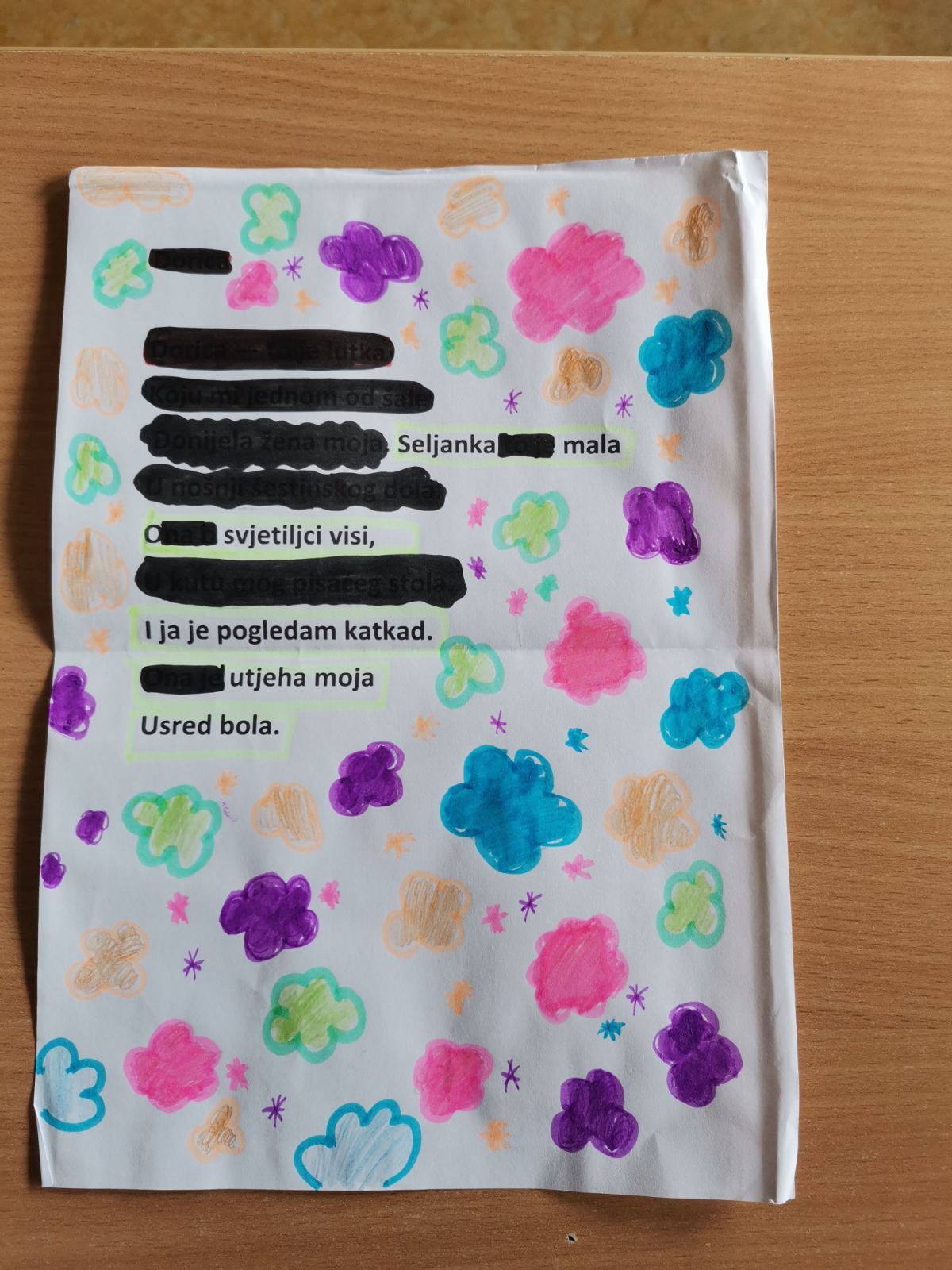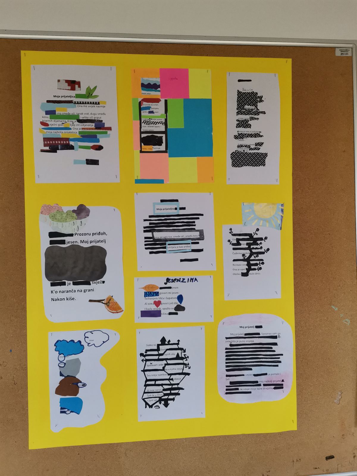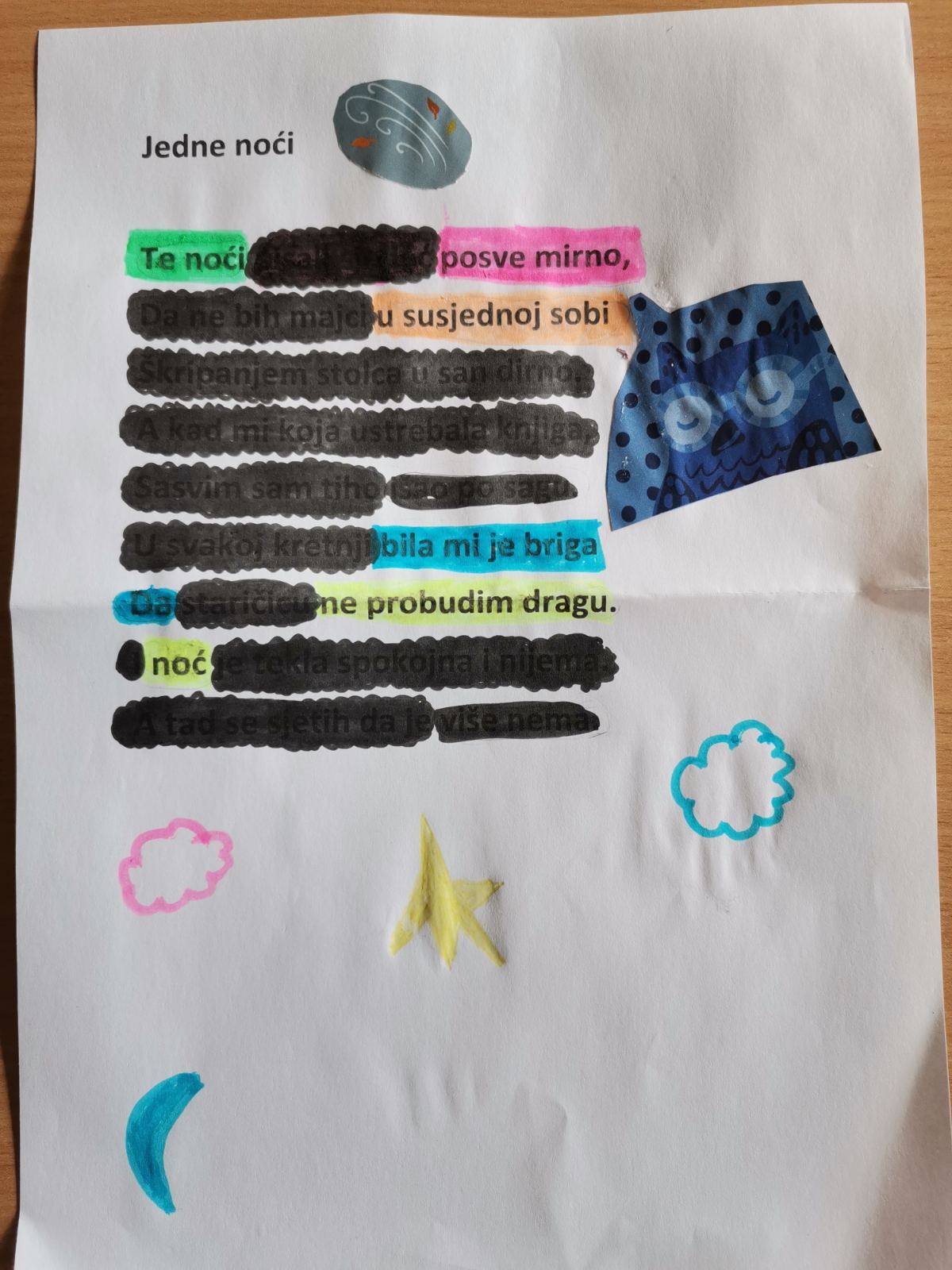 Blackout poezija nastaje tako da autor u nekom već postojećem tekstu, recimo na pjesmi ili tekstu, zaokruži riječi koje će tvoriti njegovu poeziju, a ostatak zacrni (obično crnim markerom). Izdvajanjem riječi u tekstu kreira se poezija koja je praćena likovnim izričajem s ciljem promocije književnosti i kreativnosti učenika. Svoju su poeziju stvarali i učenici 8. a i 8. b razreda na kreativnoj radionici koja je održana u učionici hrvatskog jezika kod učiteljice Indire Valkaj. Potaknuti Cesarićevim Oblakom uplovili su kao oblak u svijet kreativnosti. Radove koji su nastali pogledajte u nastavku.