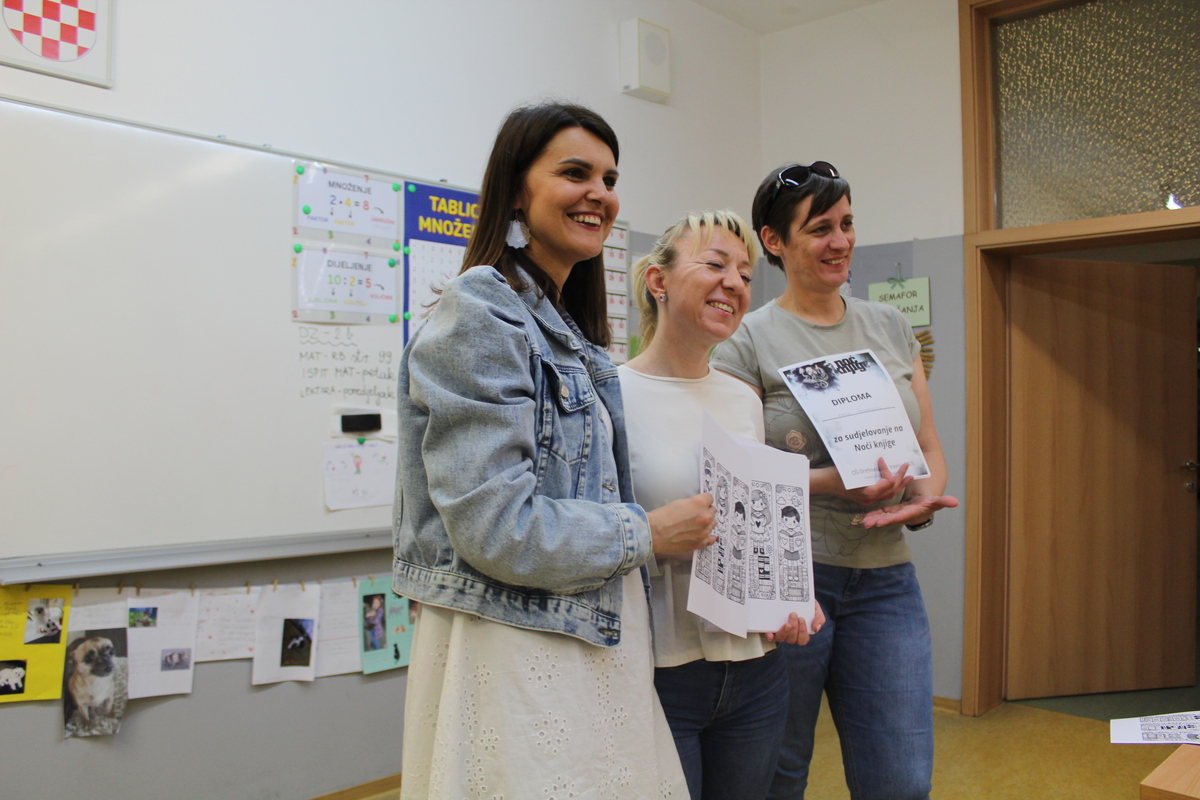 Za dobro zagrijavanje i uvod u Noć knjige pobrinula se učiteljica Kristina Vrabec koja je vodila edukativno-zabavni kviz o životinjama uz dodatak njezinih priča. Nakon toga slijedila je radionica stop-animacije u koju nas je uvukla učiteljica likovne kulture Sara Sabol koja je objasnila što je to stop -animacija, što je sve potrebno za nju i kako u konačnici dobiti dobar animirani film što je našim učenicima i uspjelo. Sudionici ovog događaja bili su učenici od drugog do sedmog razreda koji su u svakoj aktivnosti morali saživjeti u jednoj simbiozi kako bi njihov rad bio na visini zadatka. Učenici drugih i trećih razreda zajedno sa svojim učiteljicama Senijom Zadravec- Kermek i Dubravkom Drvenkar prespavali su u školi i dočekali jutro.