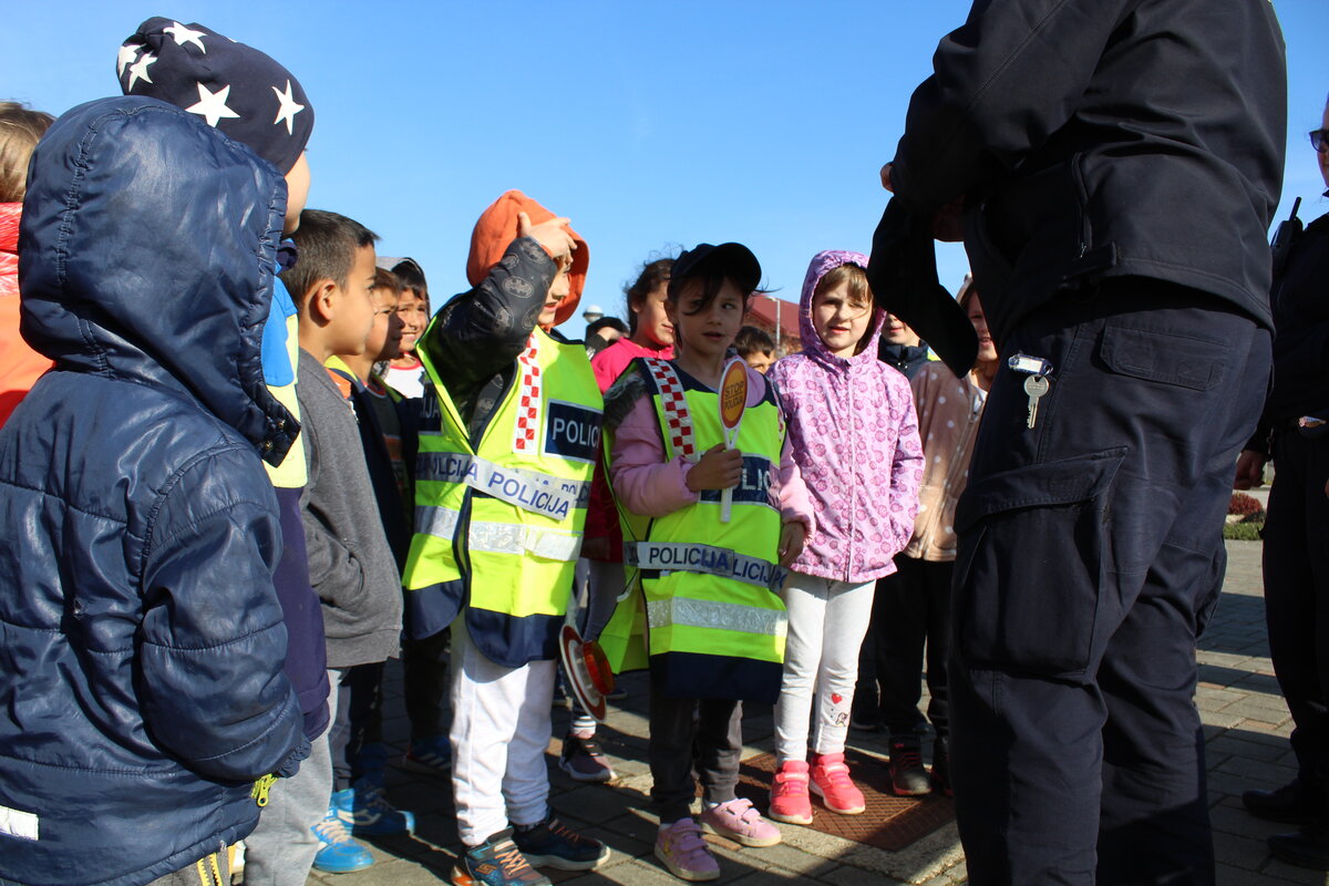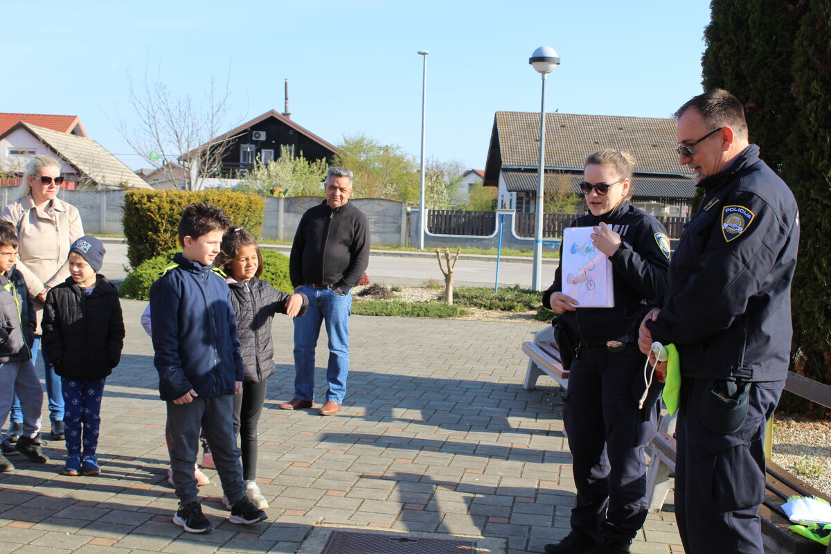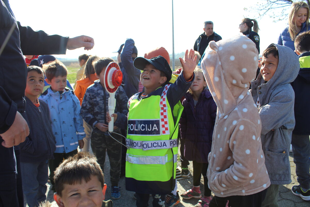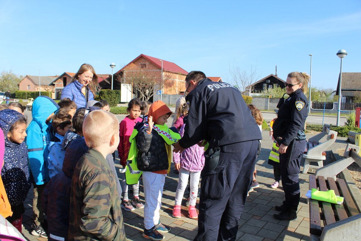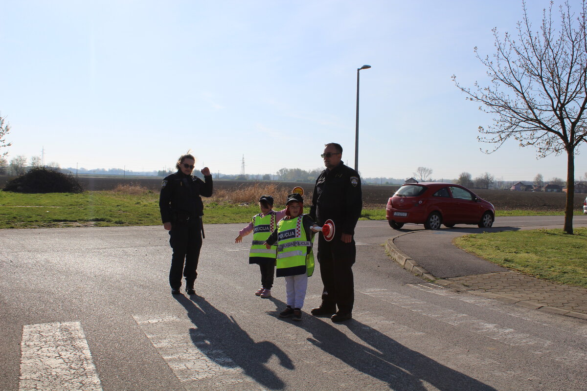 Policajci su predškolcima pokazali pravilan način kretanja prometnicama i ukazali na opasnosti koje im prijete na cesti, a sve kako bi se što bolje pripremili za sigurno sudjelovanje u prometu kada samostalno krenu u školu.