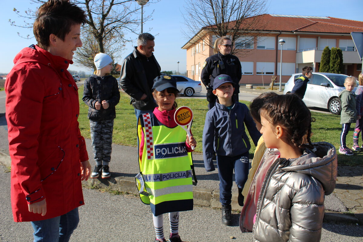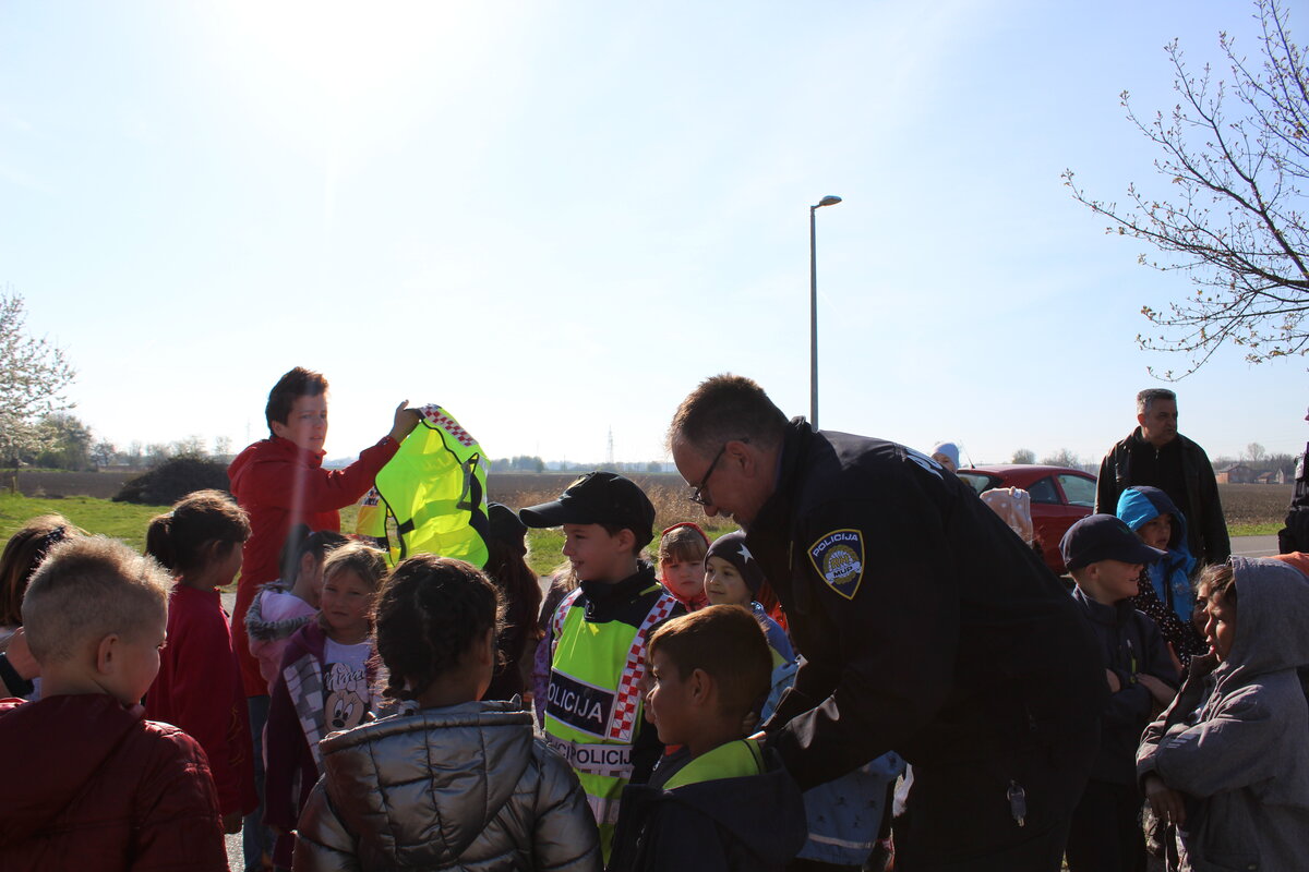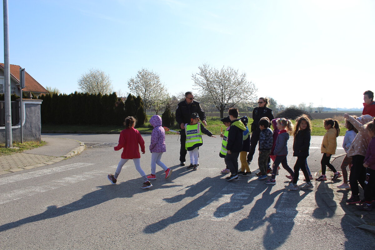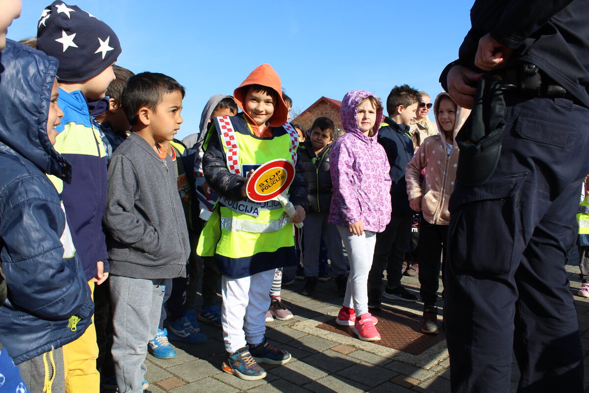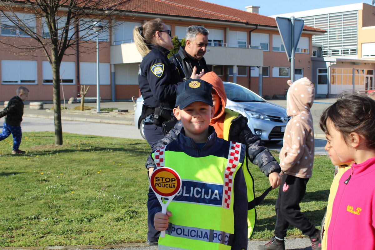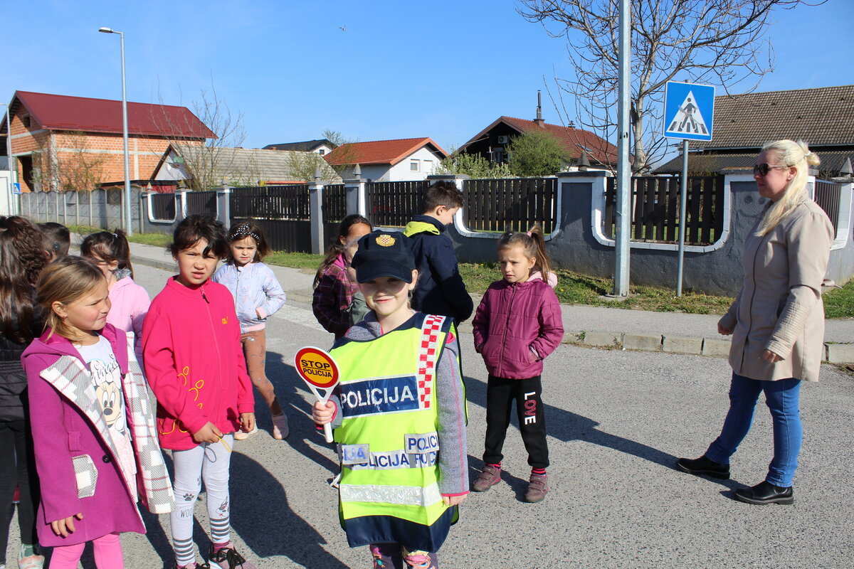 Policajci su predškolcima pokazali pravilan način kretanja prometnicama i ukazali na opasnosti koje im prijete na cesti, a sve kako bi se što bolje pripremili za sigurno sudjelovanje u prometu kada samostalno krenu u školu.