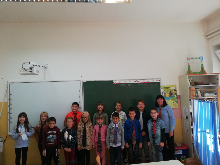 U ponedjeljak, 18.10. obilježili smo Dan kravate. Toga dana svi smo došli u školu s kravatom oko vrata. Saznali smo kako je nastala kravata. Pokušali smo je vezati, istražili koja je najveća kravata na svijetu. Nakon toga dizajnirali smo svoju kravatu.