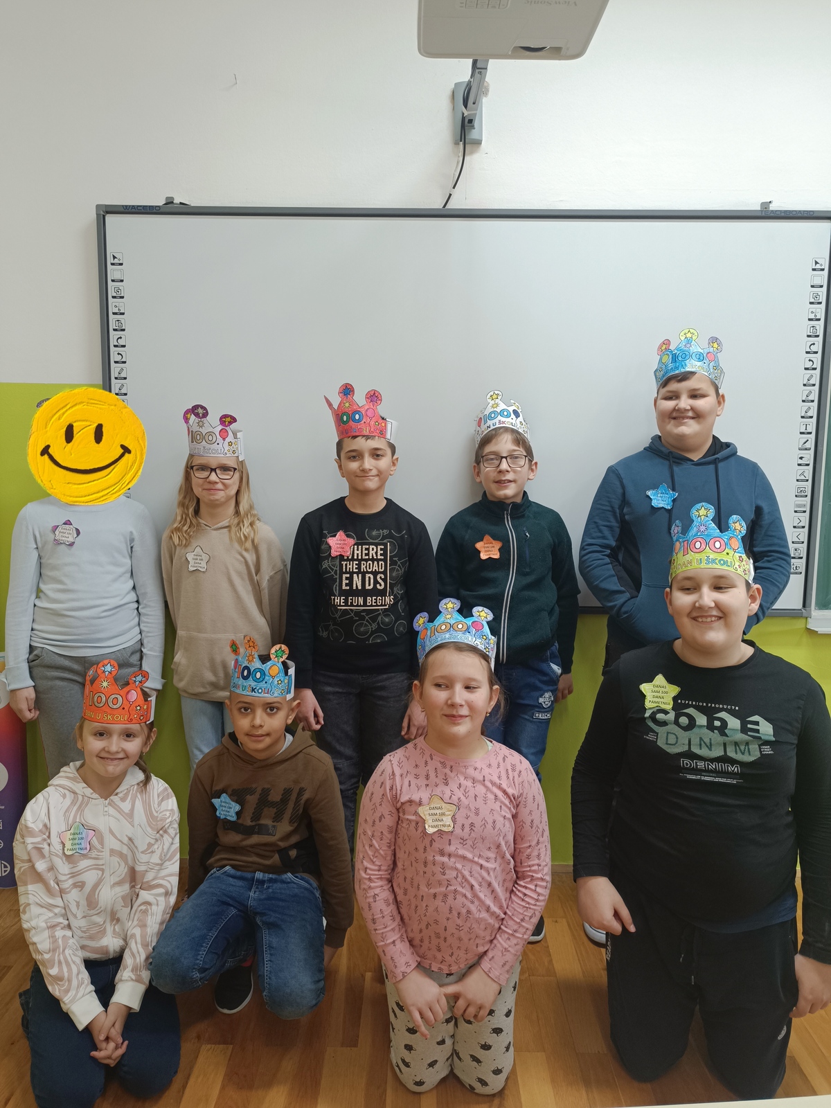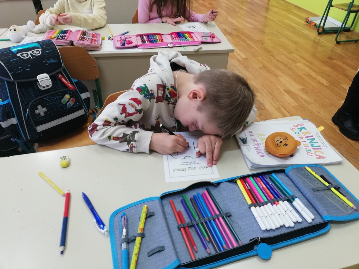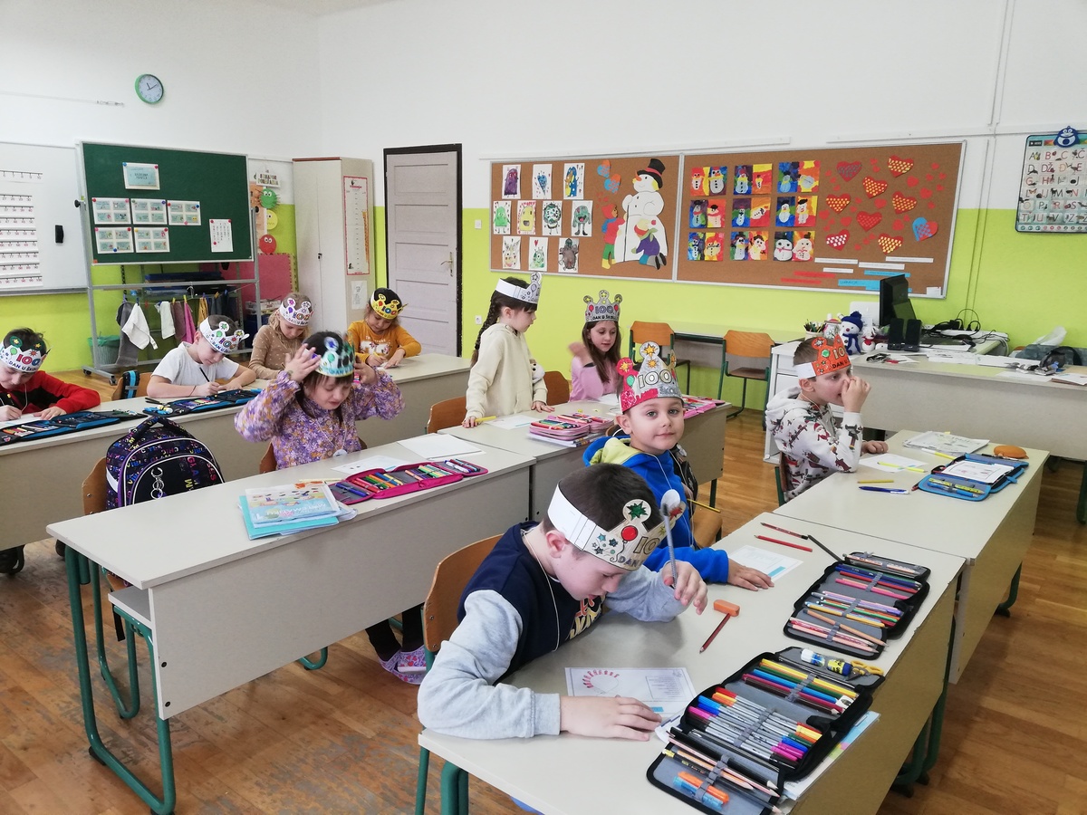 U ponedjeljak 12.2. obilježili smo 100. dan ove školske godine. Učenici 1.c/2.c igrali su igru Slovo naslovo te pričali i pisali rečenice uz kocke pričalice, izračunali 100 zadataka zbrajanja i oduzimanja, uz bacanje kockice igrali Tko će prije do broja 100 (vlak na tračnicama). Izradili smo si bedž i krune, nacrtali čudovište Stotko, dizajnirali majicu za 100. dan i vježbali 100 vježbi oblikovanja.