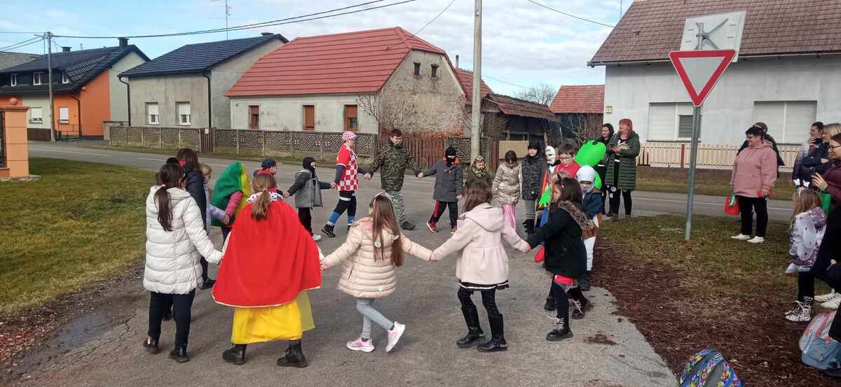 Veselo i neobično bilo je u utorak, 13.2. kada su stigla neka nepoznata maskirana djeca u našu školu. Uz smijeh, pjesmu i ples toga dana obilježili smo Fašnik. Odabrali smo svoje najmaske. Uz različite instrumente pravili smo buku po selu i otjerali kišu tako da smo mogli mirno prošetati. Kod kestena dočekali su nas naši roditelji, bake, djedovi, braća, sestre. Otplesali smo im Tu za repu, tu za len i Fašnički ples. Nagradili su nas pljeskom, finim toplim fritulama i hrpom slatkiša. Ovim putem im se od srca zahvaljujemo na tome.