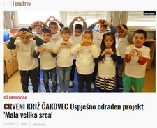 Uspješno je odrađen projekt "Mala velika srca" u suradnji Gradskog društva Crvenog križa Čakovec i Osnovne škole Orehovica čiji su se predškolci, njih 53 na sveukupno 29 radionica, educirali o temama zaštite zdravlja, očuvanja higijene, ali i o vrijednostima humanizma. Članak je obavljen i u online novinama eMeđimurje pa pogledajte priču!