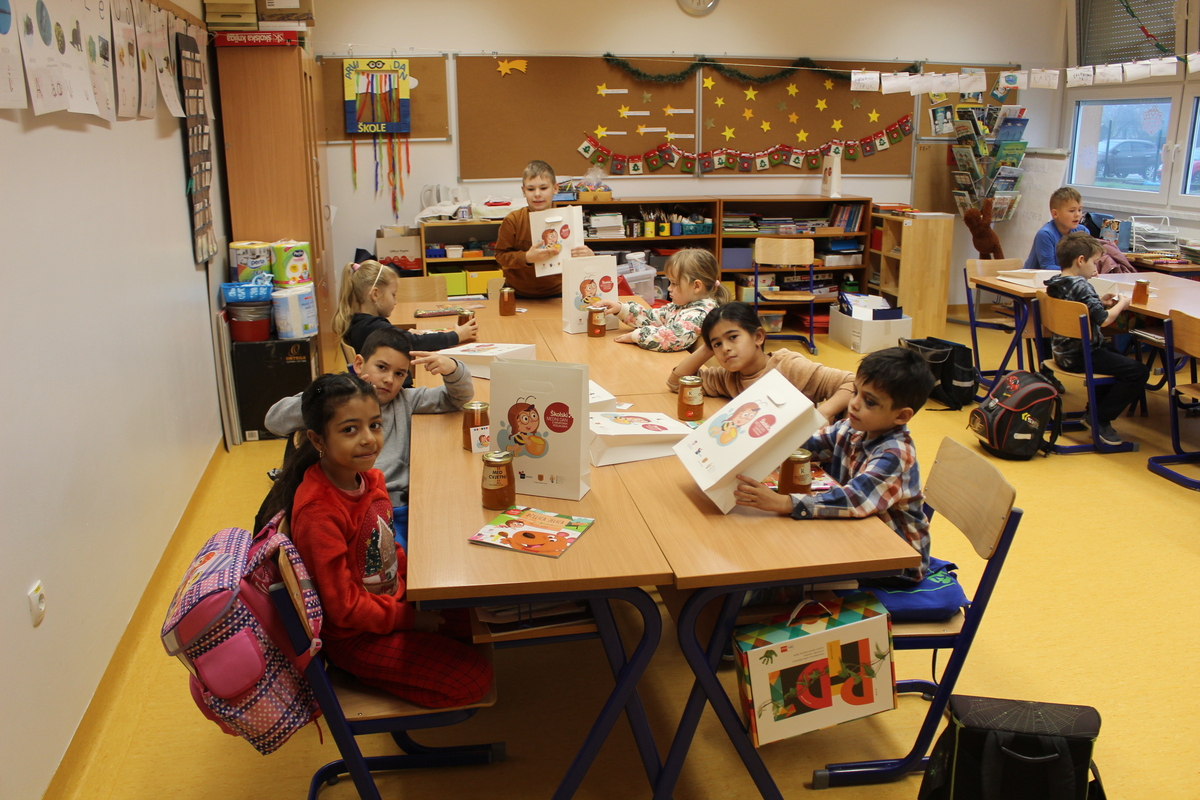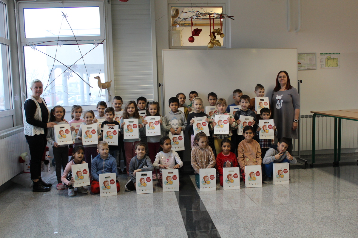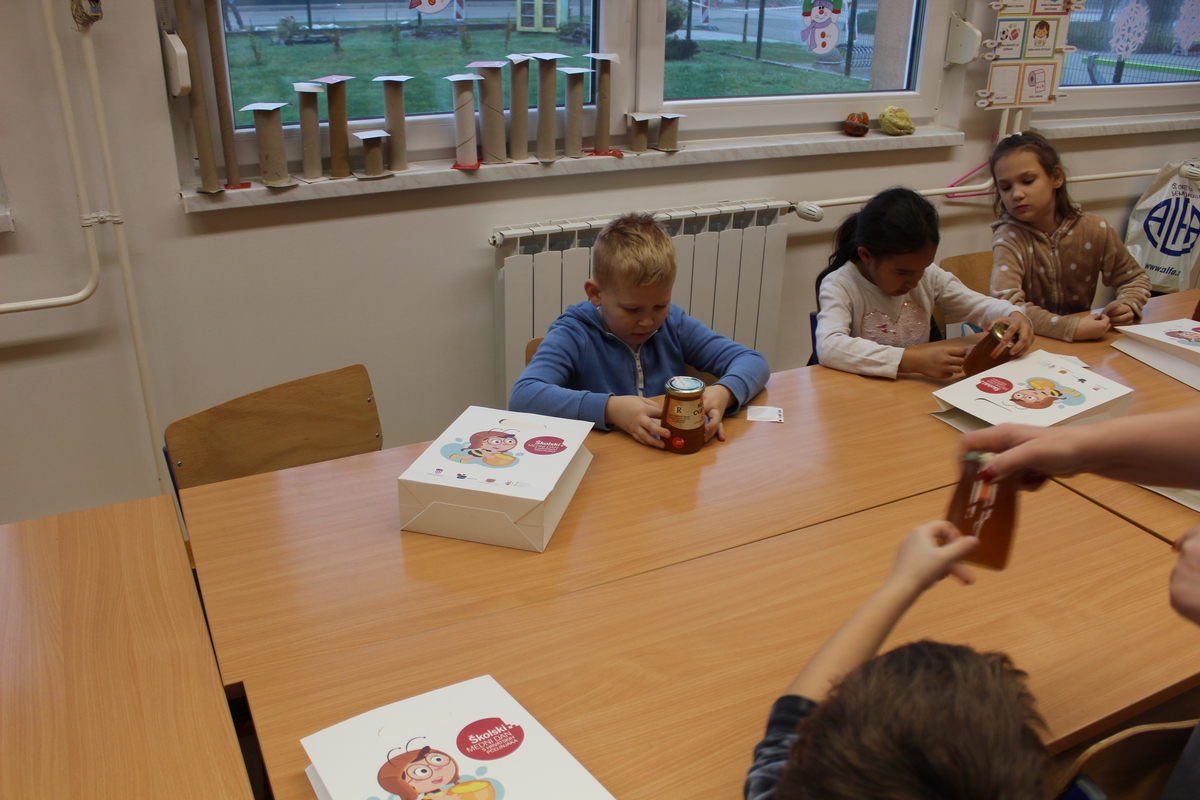 Prvašići su također dobili paketiće u kojima se nalazio Med hrvatskih pčelinjaka, edukativna slikovnica "Pčelica Jelica i medo Edo", te letak "Med hrvatskih pčelinjka", s informacijama o medu. Tako smo saznali i da je med slađi od šećera, da je izvor vitamina i minerala, te da ćemo zato biti puni energije kada se zasladimo njime. U učionici 1.b razreda bilo je jako veselo i medeno!
