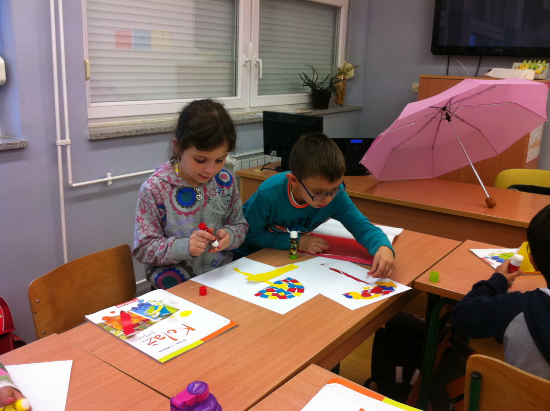 Stigla je jesen i u 1. a razred. Ali ni ovog puta nije stigla sama. Sa sobom je dovela svoje vjerne prijatelje: vjetar i tamne kišne oblake. Oblaci su se nagomilali te je iz njih počela padati prava jesenja kiša. Kako ne bi pokisli, učenici su izradili prekrasne kišobrane iz kolaža koristeći se pri tom osnovnim bojama: crvenom, žutom i plavom. Vjetar pak se neprestano igrao sa lišćem koje je počelo polagano gubiti svoju boju. Vodenim bojama učenici su dočarali šareni svijet jesenskog lišća. Također, iz gline su izradili prekrasne životinjice: sićušne, slatke, ali i one mrvicu opasnije. Što je sve jesen donijela u naš razred, pogledajte u nastavku…