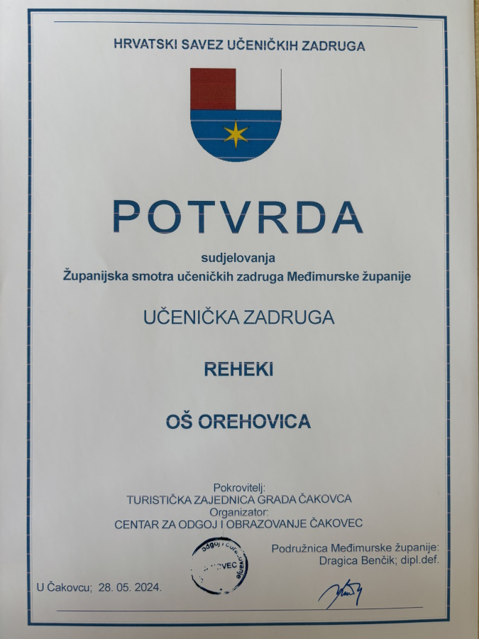 U utorak 28. svibnja članovi naše učeničke zadruge Reheki sudjelovali su na Županijskoj smotri učeničkih zadruga Međimurske županije.