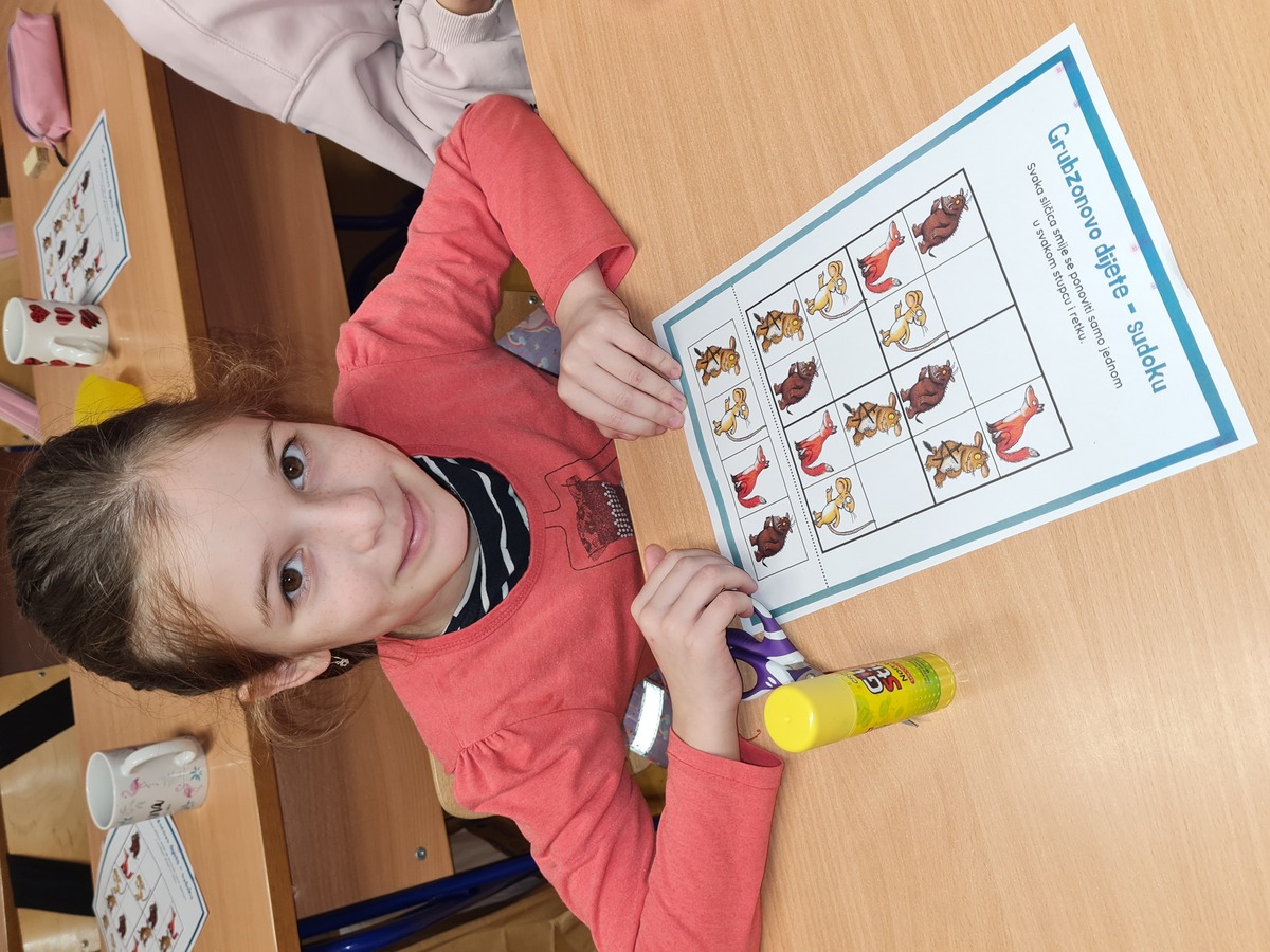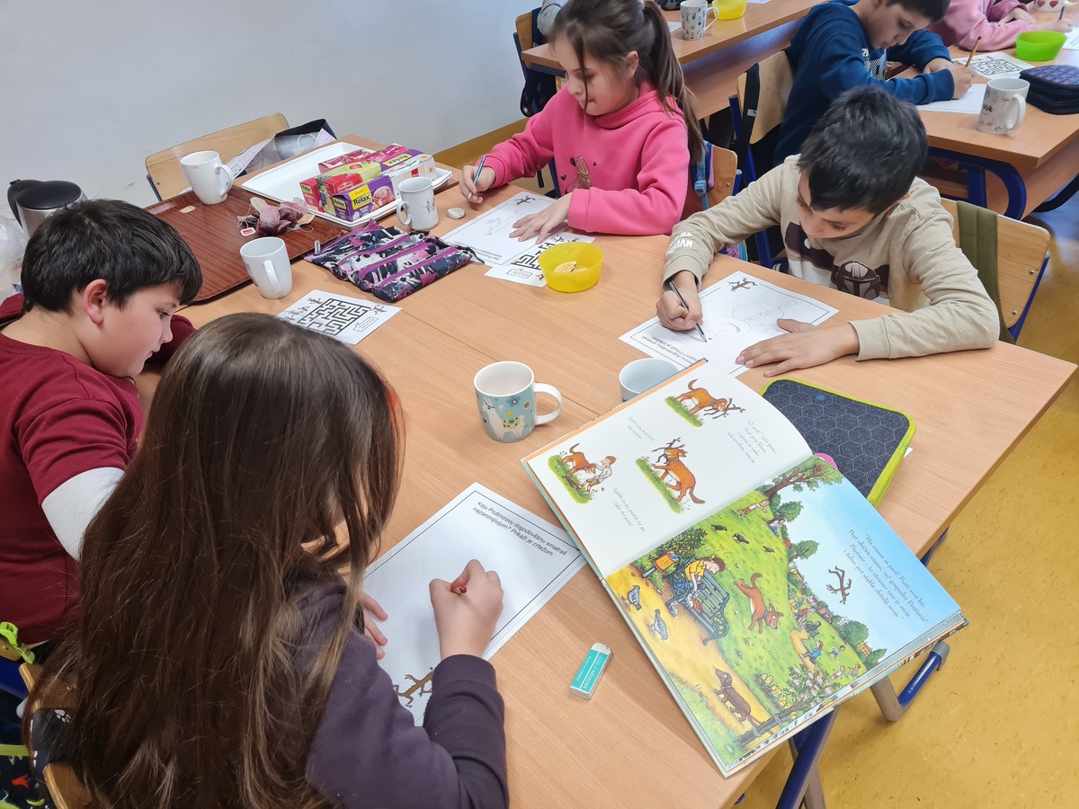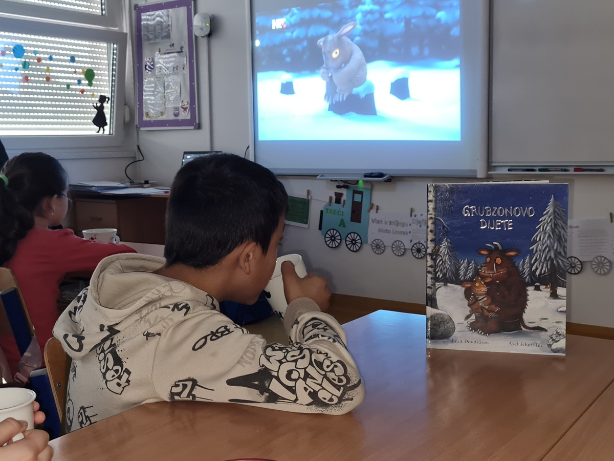 Učenici trećeg a razreda kroz zimsko su razdoblje nastavili s provođenjem čajanki u sklopu projekta „Čajanka s tetom Julijom“. Upoznali su slikovnice Julie Donaldson koje su sadržajem vezane uz najhladnije godišnje doba: zimu. Tako su upoznali strašnog stvora Grubzona, a zatim i njegovo dijete: Grubzončicu. U ove su se slikovnice učenici naprosto zaljubili i slušali ih s mnogo interesa, nestrpljivo iščekujući maštovite ideje ispisane na svakoj sljedećoj stranici slikovnice. Također, pogledali su istoimene animirane filmove te uočili sličnosti i razlike između filma i slikovnice. Valja spomenuti još jednog neobičnog lika kojeg su upoznali, gospodina Prutimira. Njegova avantura počinje kada tijekom svog ranojutarnjeg treninga postaje igračka razigranog psa, nakon čega upada u niz nevolja i opasnosti iz kojeg se nikako ne može izbaviti. Osim što su uživali u keksima, čaju, slušanju slikovnica učenici su se bavili mnoštvom zanimljivih aktivnosti. Imenovali su i označavali Grubzonove dijelove tijela, rješavali sudoku i osmosmjerku s pojmovima iz slikovnice, pomogli Grubzončici pronaći izlaz iz labirinta, odredili pravilan redoslijed Prutimirovih nevolja te crtali najzanimljiviju Prutimirovu avanturu, … Djelić vesele atmosfere pogledajte na fotografijama u nastavku.