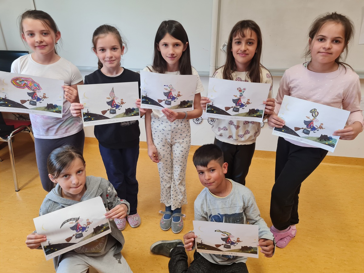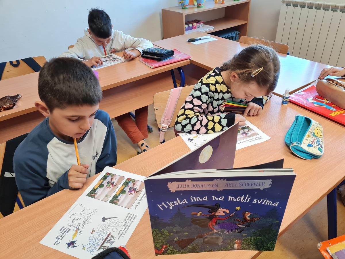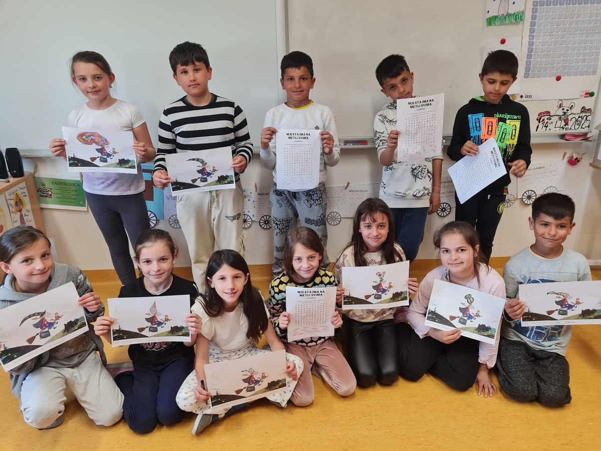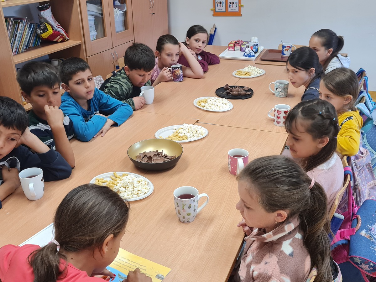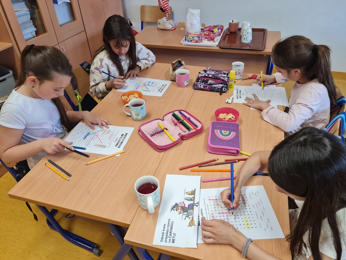 Tako ni mi ne mirujemo. Dapače, aktivno provodimo naše čajanke. Čitamo o novim pustolovinama i zgodama sasvim novih junaka. Pogledali smo i animirani film koji je nastao temeljem slikovnice koja nas je toliko osupnula da smo o njoj dodatno istraživali, a naziva Mjesta ima na metli svima. Proveli smo i obrnutu čajanku. Čajanku koju smo organizirali i u cijelosti proveli mi, učenici. Od pripreme čaja, grickalica, odabira naslova za čitanje, samog čitanja, pripreme aktivnosti koje su slijedile nakon čitanja, … Sve je to bio naš posao. Odradili smo ga lavovski. Bilo je teško, zahtjevno, no u istu ruku zanimljivo, fascinantno, zgodno, sasvim drugačije. Zavirite u fotografije i sve će vam biti jasno.