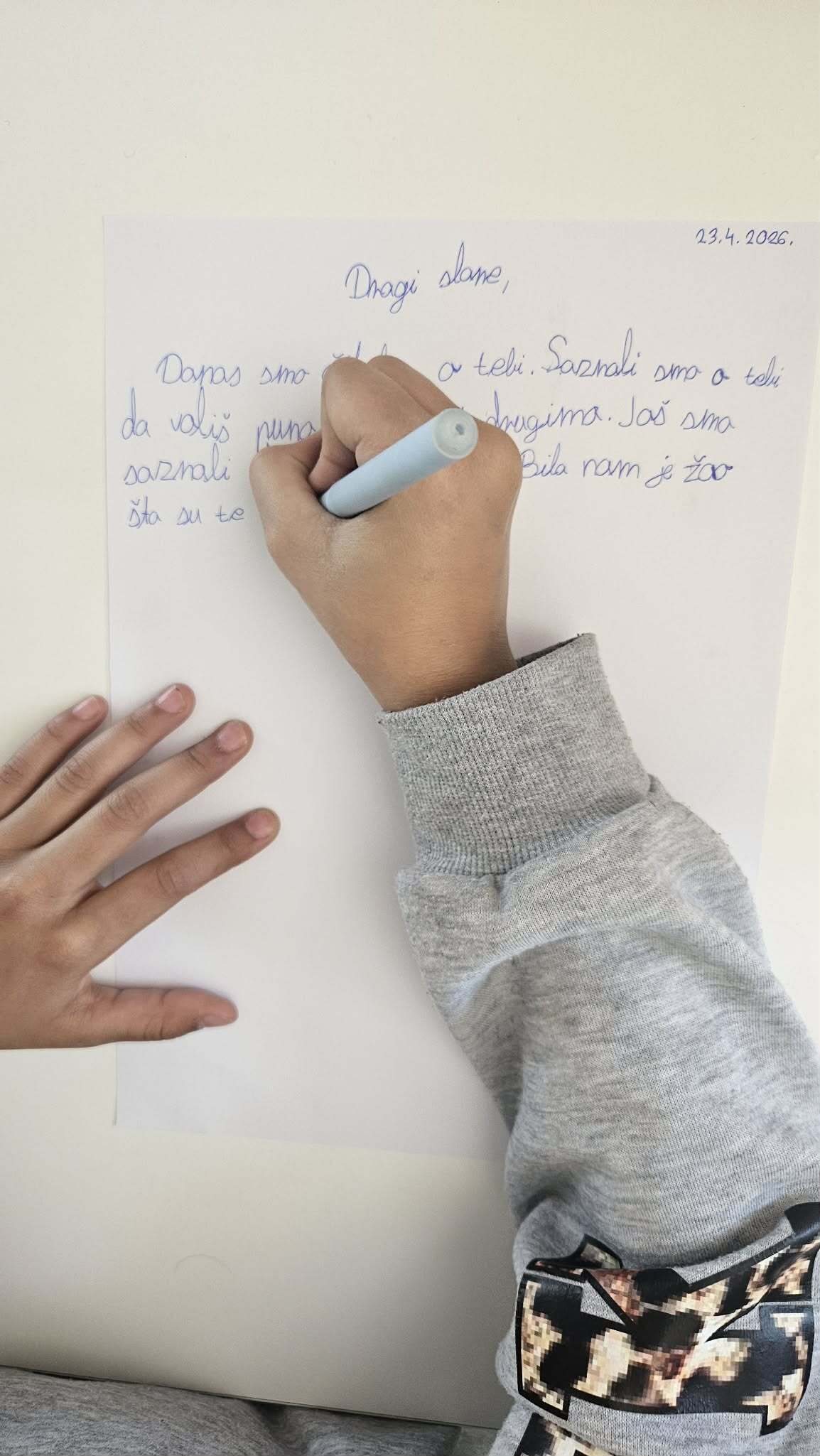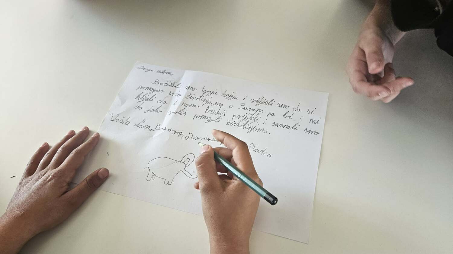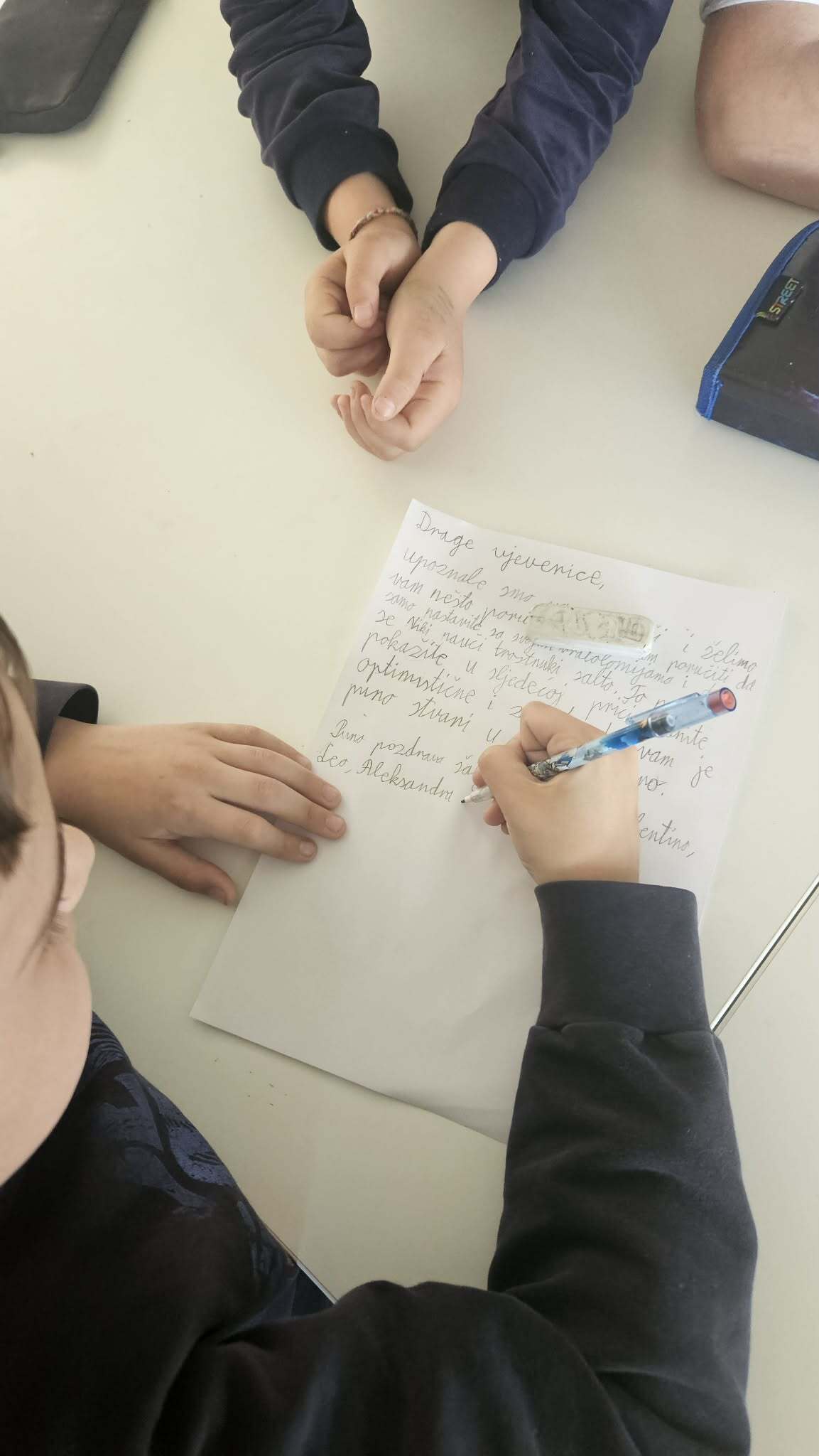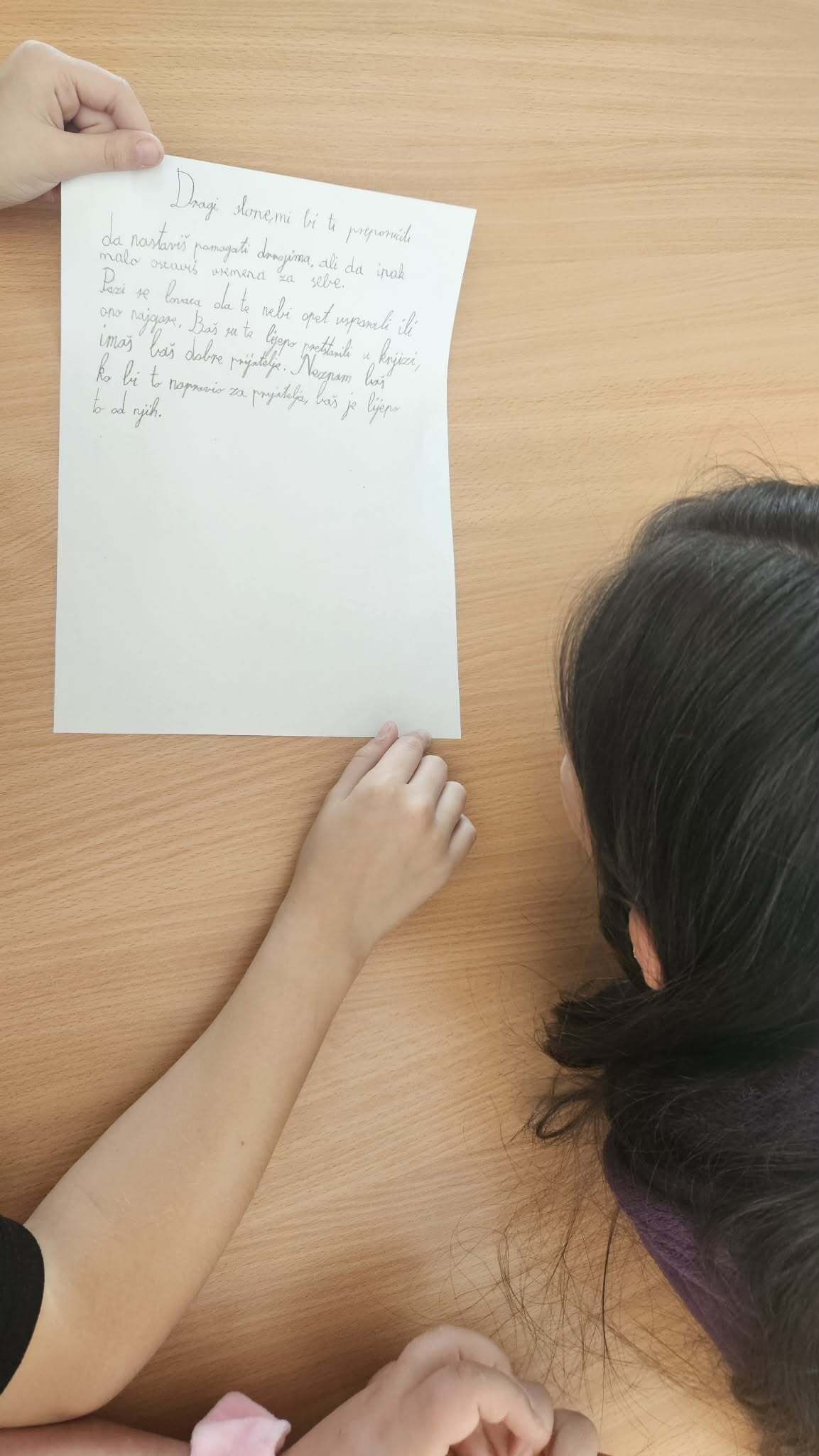 Učenicima 3. i 4. razreda školska knjižničarka Sanja Glavak pročitala je slikovnice o optimizmu, velikodušnosti, zajedništvu i prijateljstvu, a učenici su nakon toga, radeći u grupama, pisali pismo likovima iz priča i iskazali riječima kako su se oni osjećali na njihovim mjestima i što bi, i kako, eventualno, drugačije napravili. Njihove učiteljice Dubravka Drvenkar i Senija Zadravec-Kermek pritom su im pomagale i usmjeravale ih.