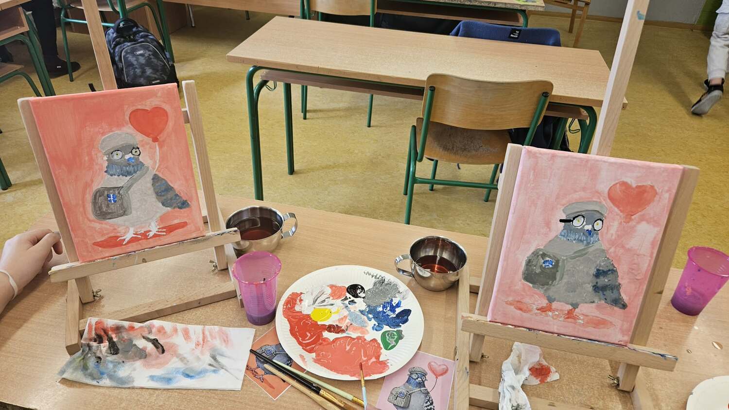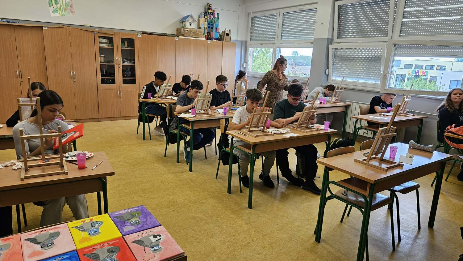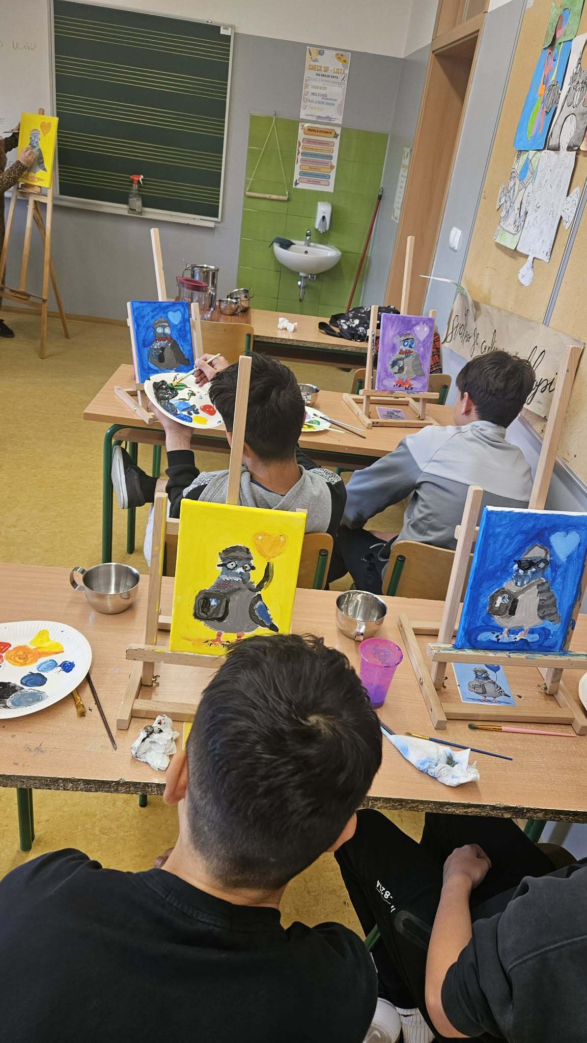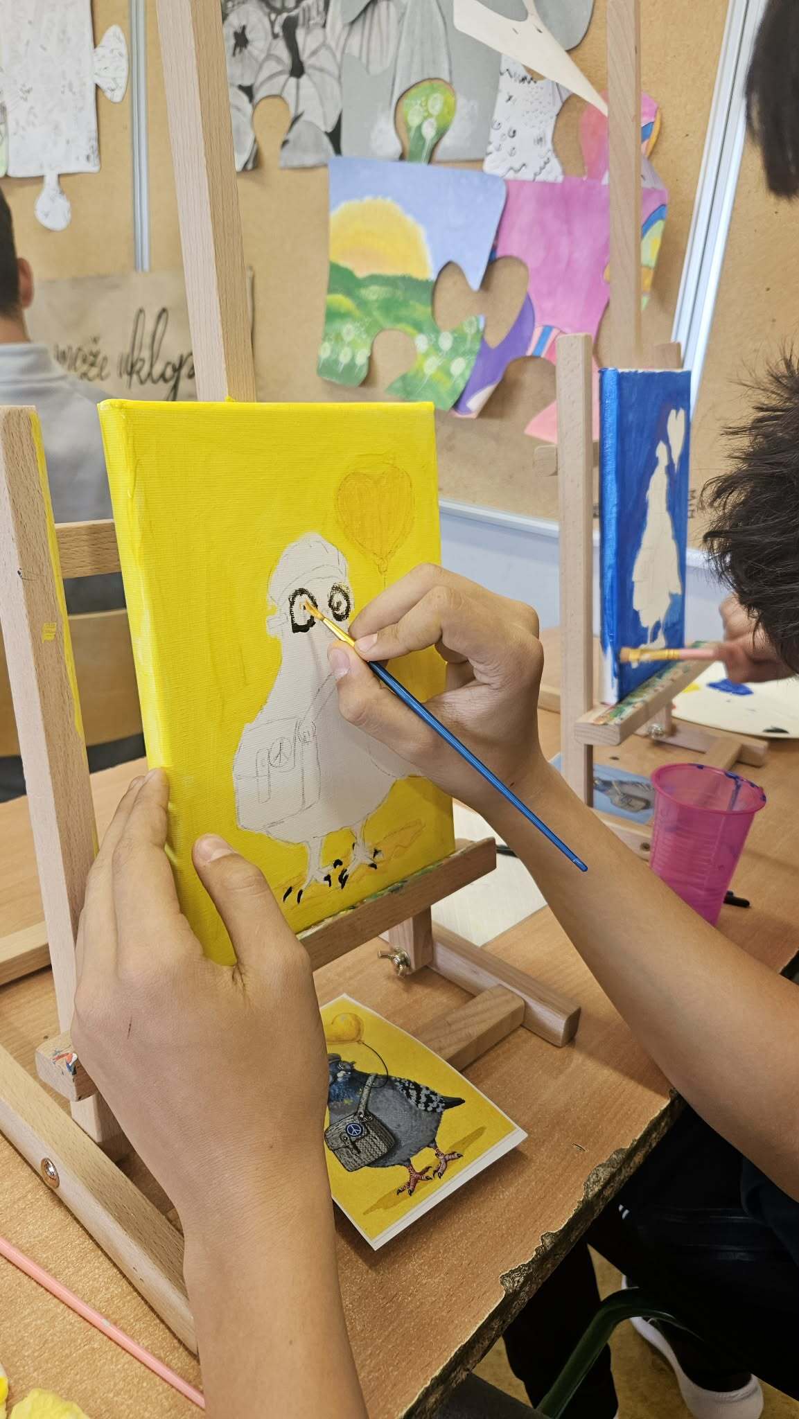 Učenici 6. i 7. razreda na platnu su akrilnim bojama oslikavali lik goluba, a radionicu je vodila učiteljica likovne kulture Sara Sabol. Oslikavajući zajedno s njom, guštajući u finom vrućem čaju i laganoj muzici, učenici su svojom kreativnošću i bojama oživjeli lik goluba i tako su nastali predivni radovi koji sada krase hol naše škole. Jedan je našao svoje mjesto i u knjižnici.