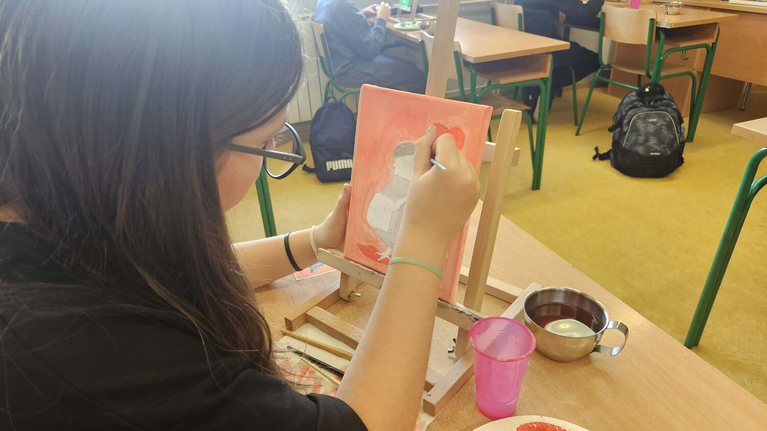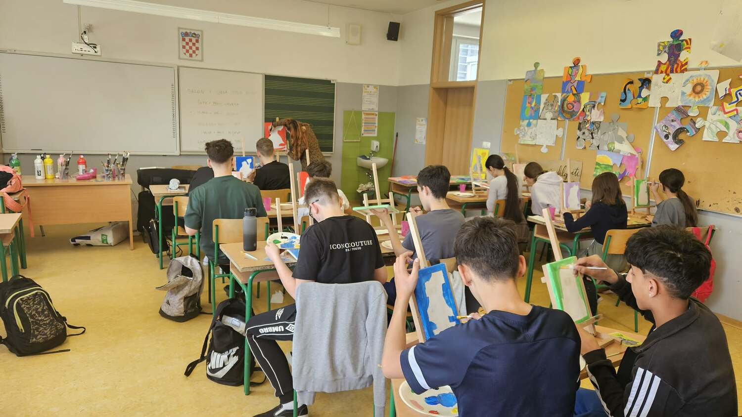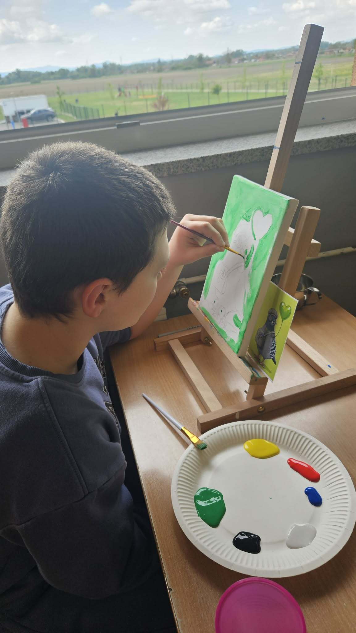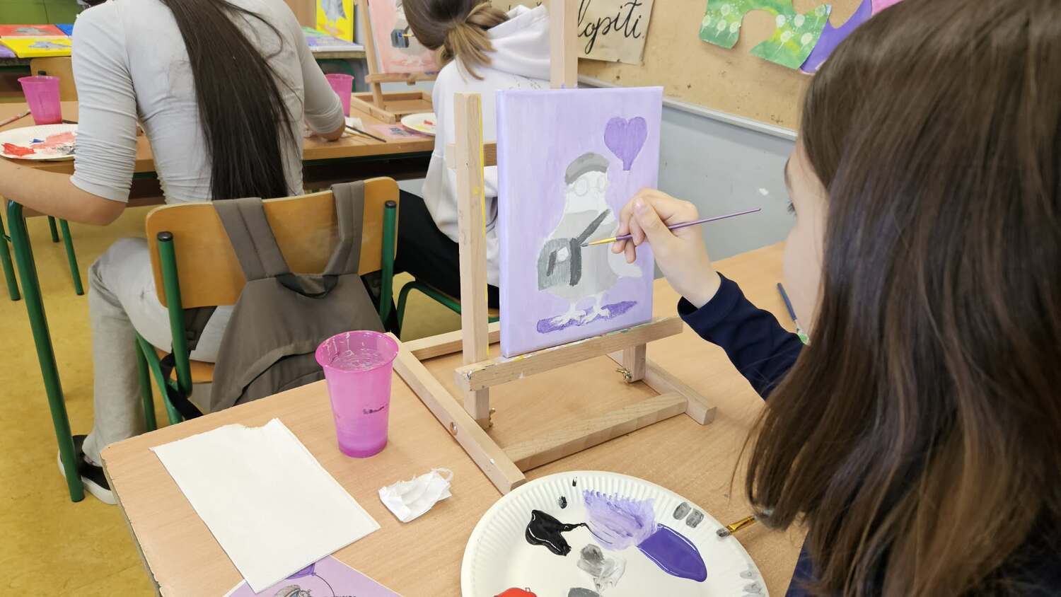 Učenici 6. i 7. razreda na platnu su akrilnim bojama oslikavali lik goluba, a radionicu je vodila učiteljica likovne kulture Sara Sabol. Oslikavajući zajedno s njom, guštajući u finom vrućem čaju i laganoj muzici, učenici su svojom kreativnošću i bojama oživjeli lik goluba i tako su nastali predivni radovi koji sada krase hol naše škole. Jedan je našao svoje mjesto i u knjižnici.