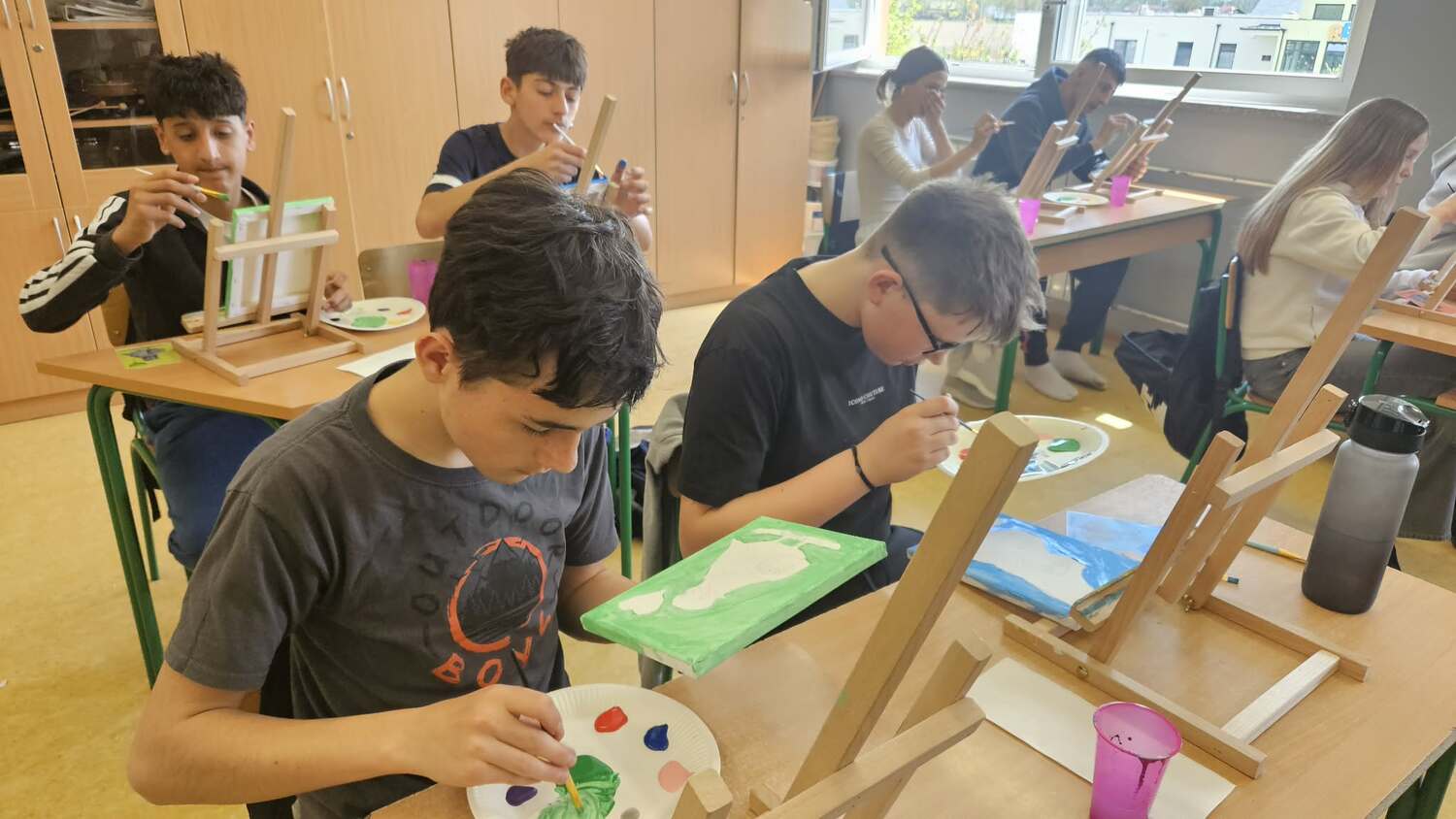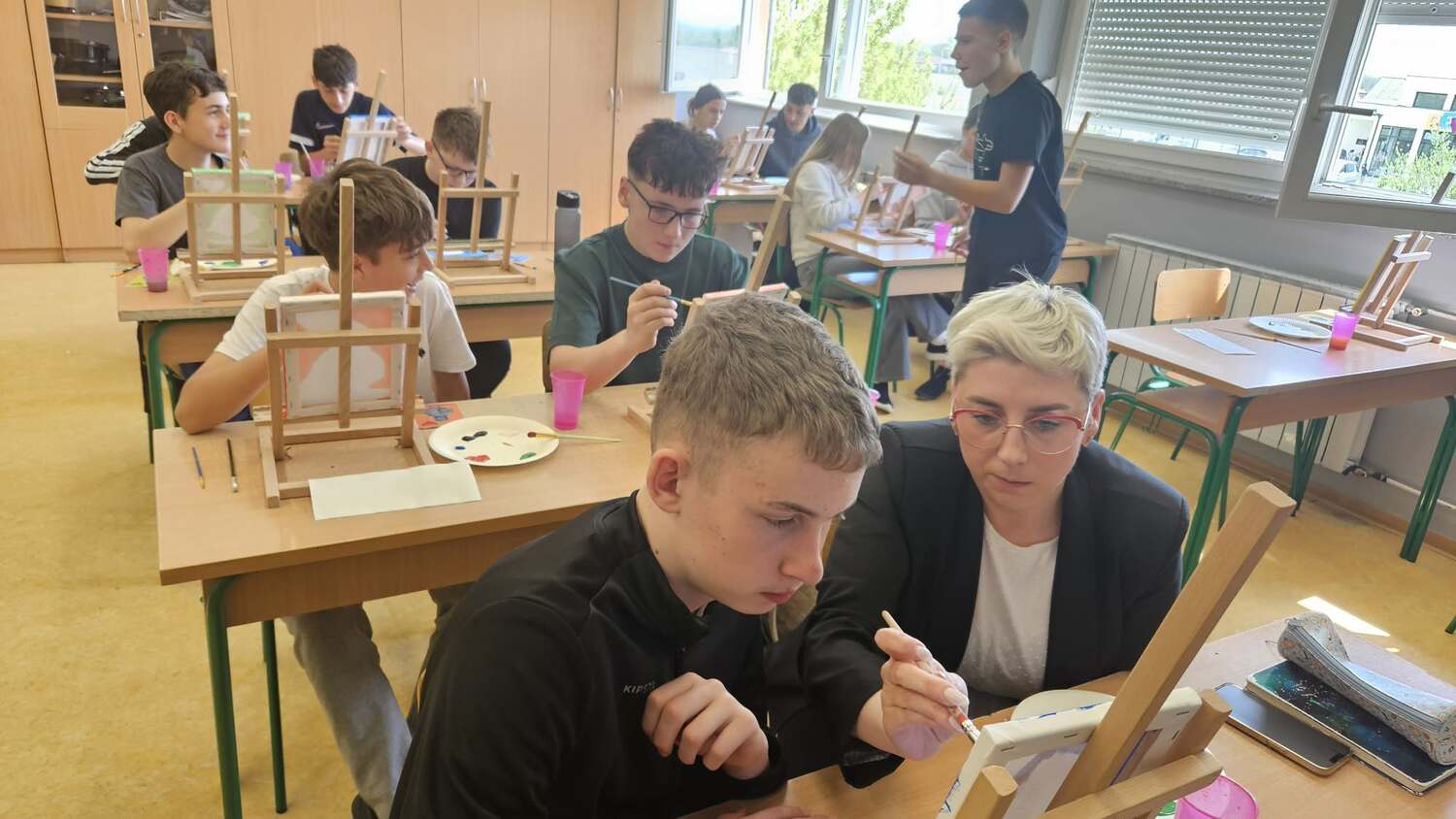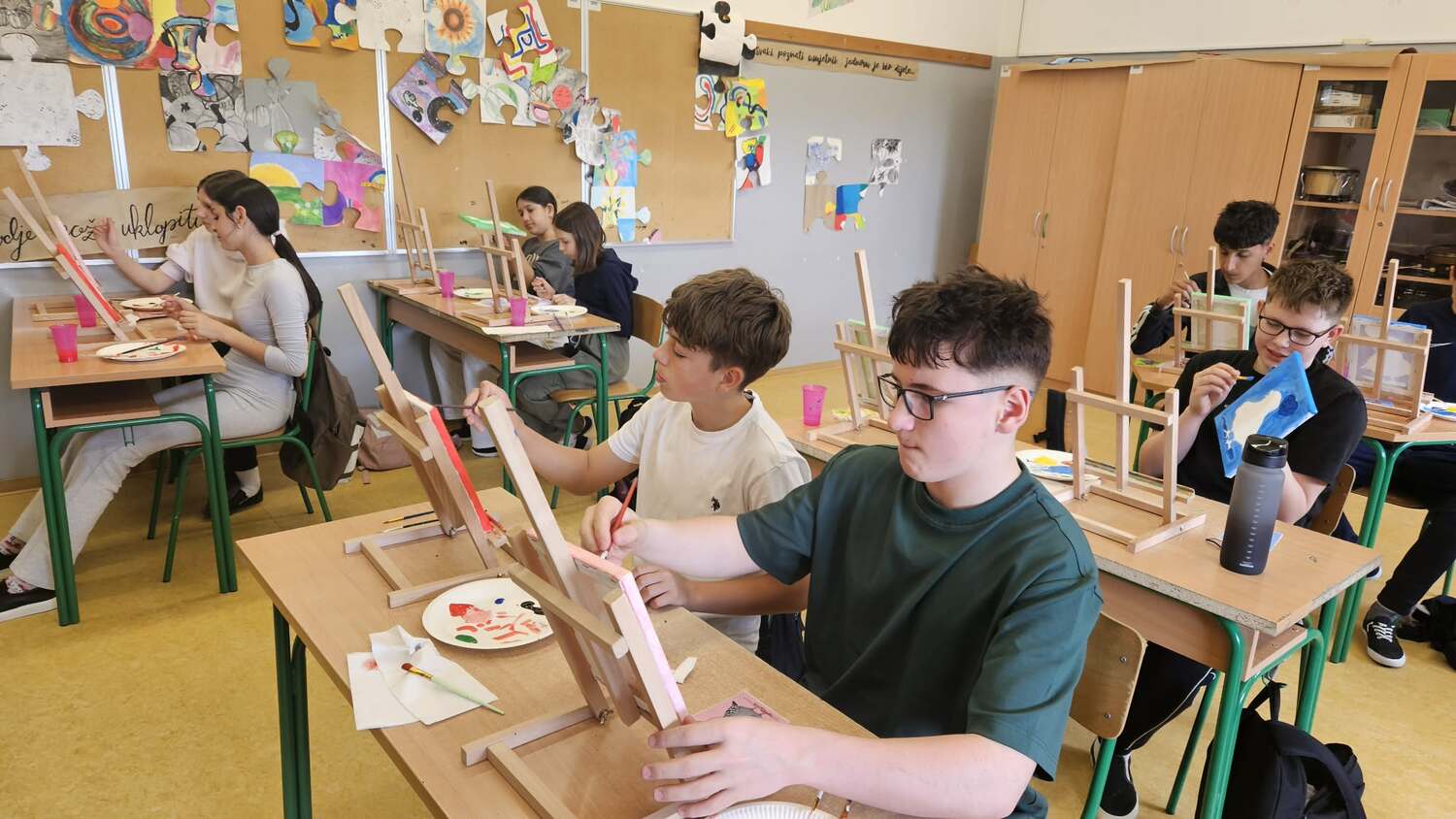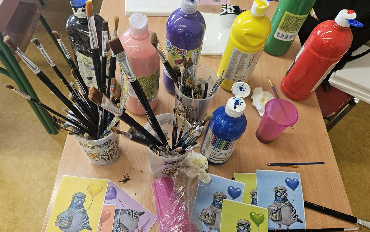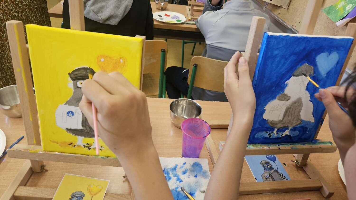 Učenici 6. i 7. razreda na platnu su akrilnim bojama oslikavali lik goluba, a radionicu je vodila učiteljica likovne kulture Sara Sabol. Oslikavajući zajedno s njom, guštajući u finom vrućem čaju i laganoj muzici, učenici su svojom kreativnošću i bojama oživjeli lik goluba i tako su nastali predivni radovi koji sada krase hol naše škole. Jedan je našao svoje mjesto i u knjižnici.