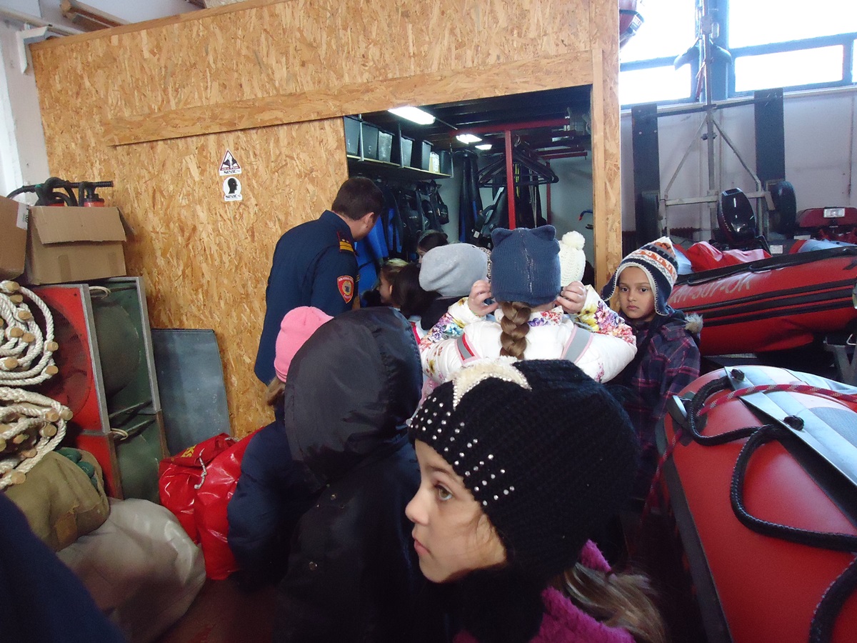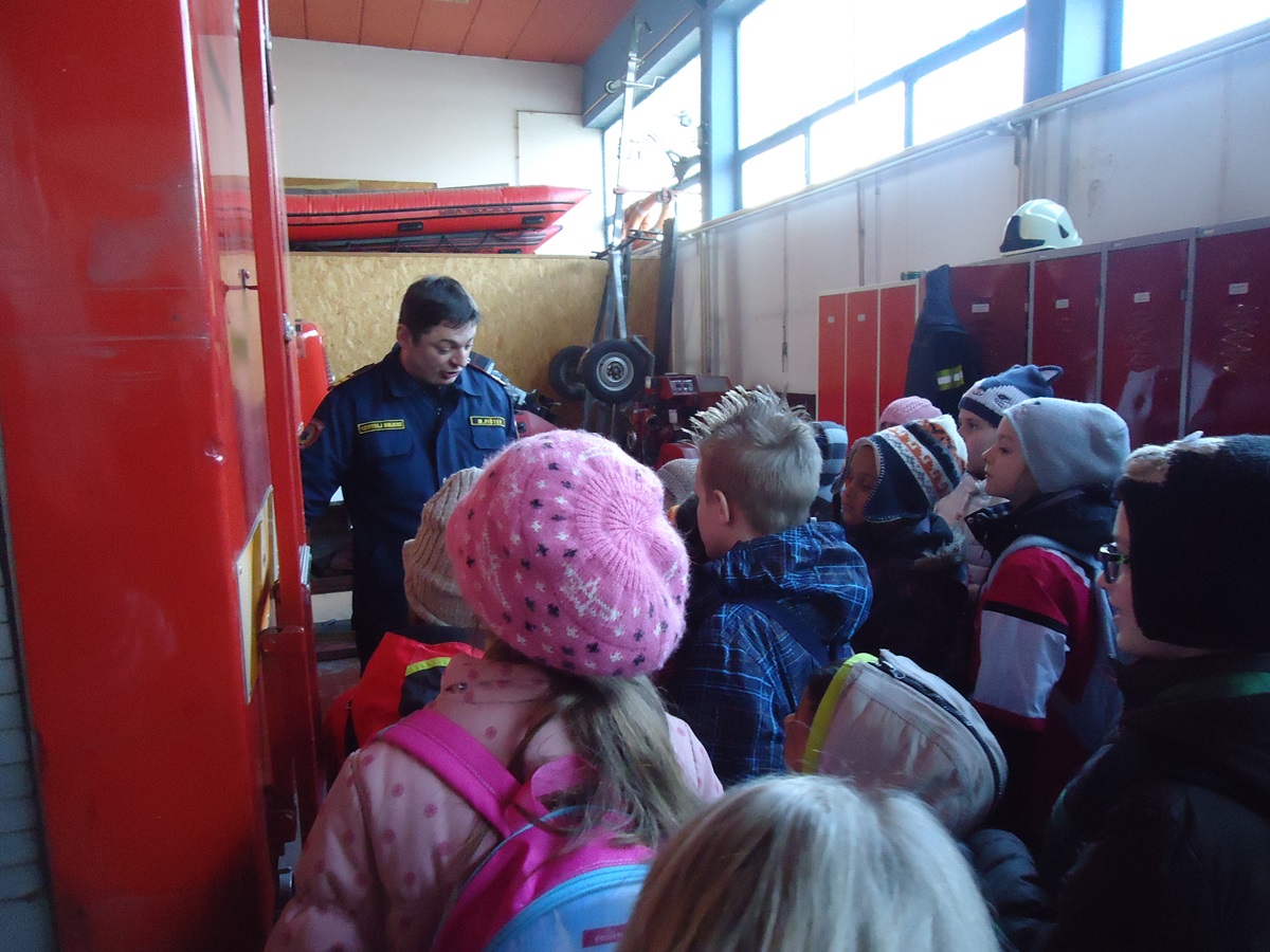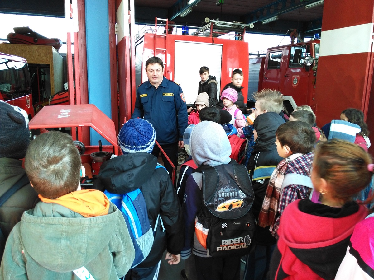 Najprije smo posjetili vatrogasce. Razgledali smo garažu s vozilima i opremom, a vatrogasac Miljenko sve nam je detaljno pokazao i objasnio o važnom poslu vatrogasaca. Nakon razgledavanja garaže odveo nas je u „dojavnu sobu“, gdje se nalazi različita kompjuterska oprema, a dežurni vatrogasac iznenadio nas je kad je uključio sirenu kao probu za oglašavanje uzbune. Vatrogasci imaju i prostoriju za vježbanje s različitim spravama, koju koriste za održavanje kondicije. Tu nam je bilo najzanimljivije, jer su nam vatrogasci dopustili da isprobamo sve sprave. Na kraju su nas počastili sokom i slatkišima. Puni dojmova, zahvalili smo im i pozdravili se s njima.