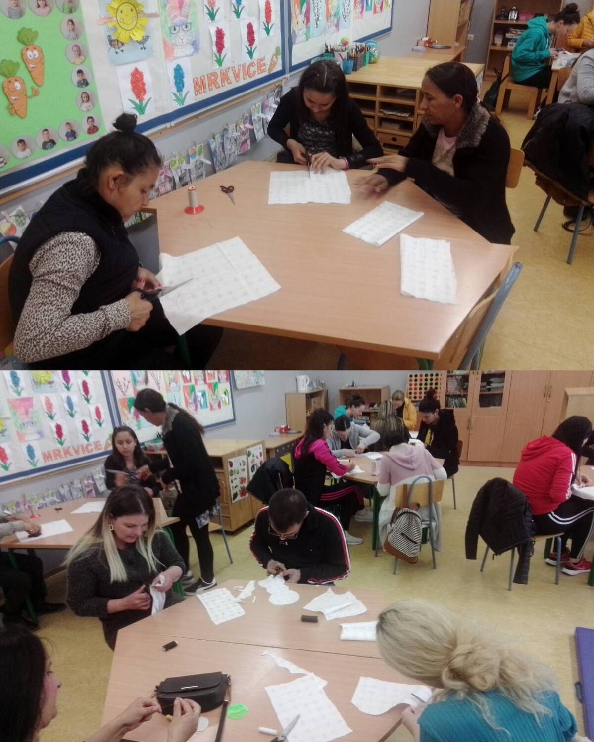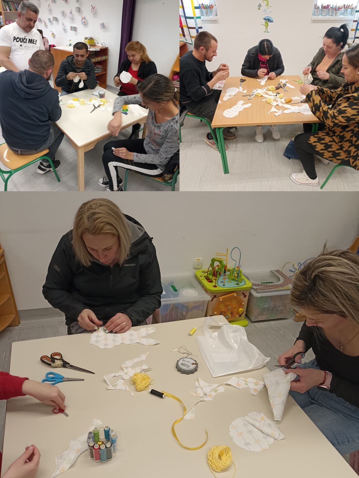 Roditelji su na radionici šivali zečeve. Bilo je potrebno skrojiti predloške za zeca, zašiti oba dijela zajedno, unutra staviti punjenje i po želji ukrasiti mašnom. Dovršene radove roditelji su nosili doma svojoj djeci. Kako je bilo, pogledajte u fotogaleriji.