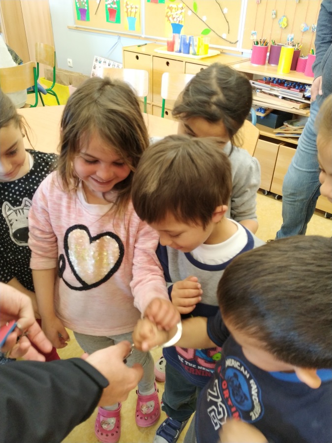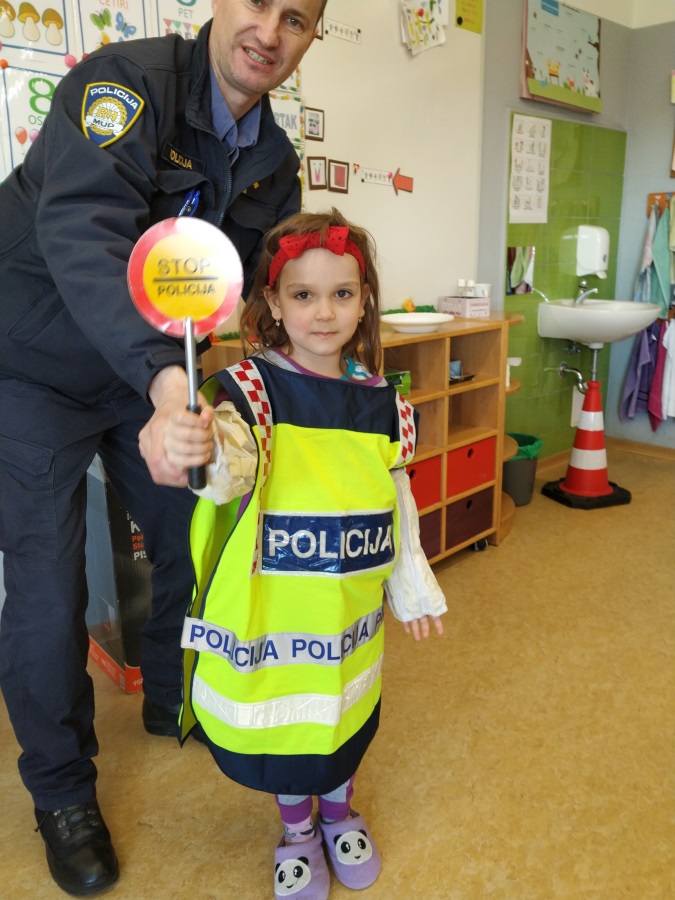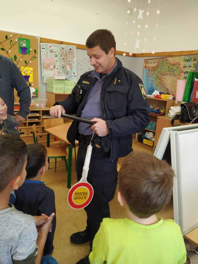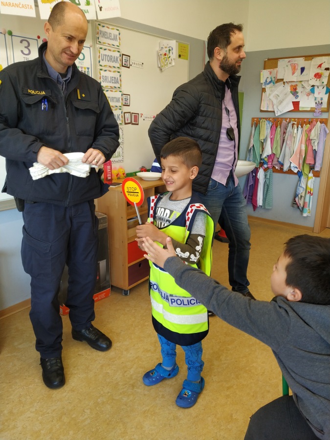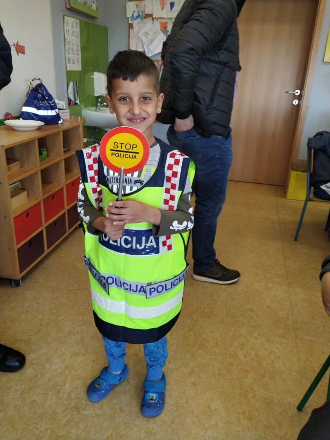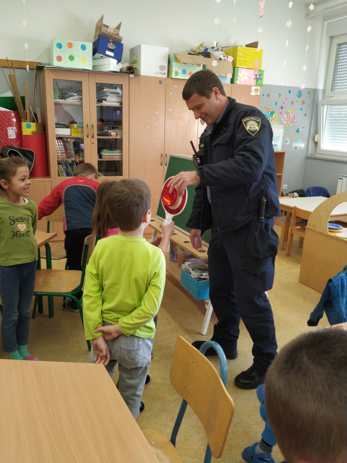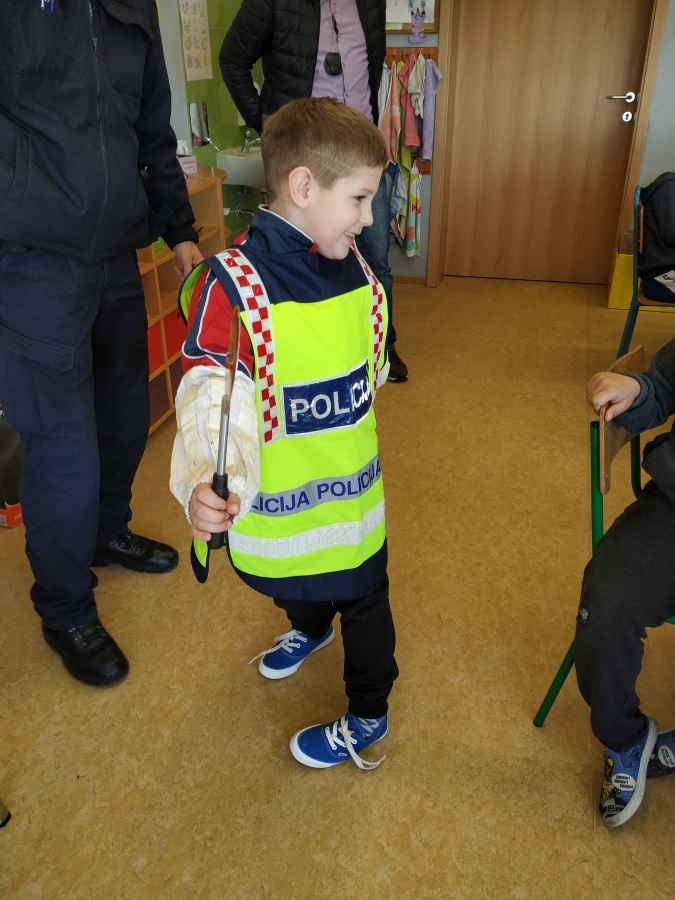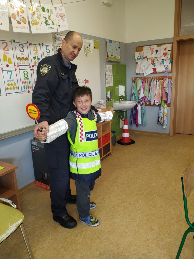Nakon kratkog predavanja djeca su isprobala prsluk i palicu koju policijski službenici koriste prilikom zaustavljanja prometa. Gospodin Tomislav je objasnio djeci kako prometni policajac treba stajati, te kako treba okrenuti palicu.