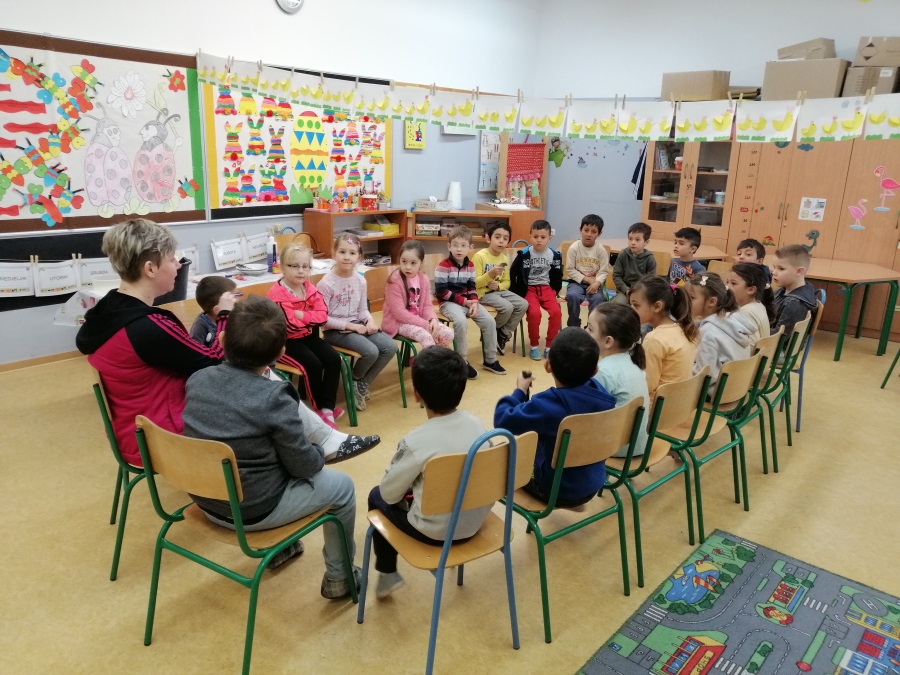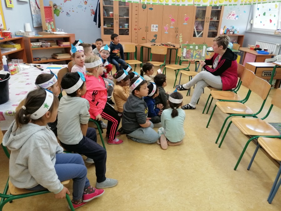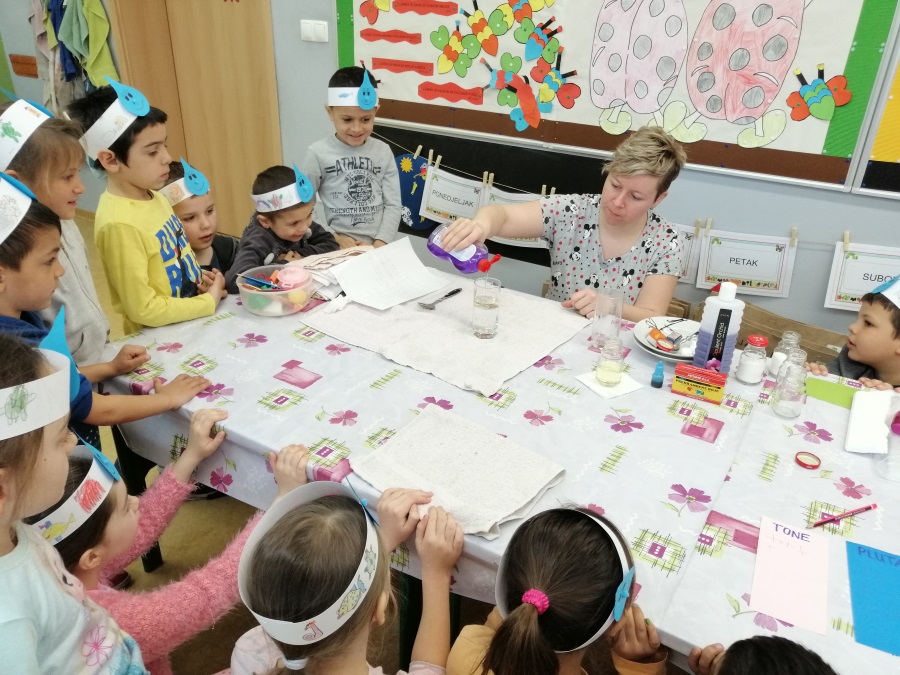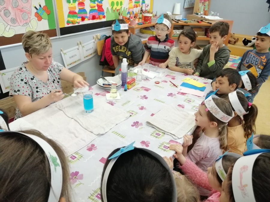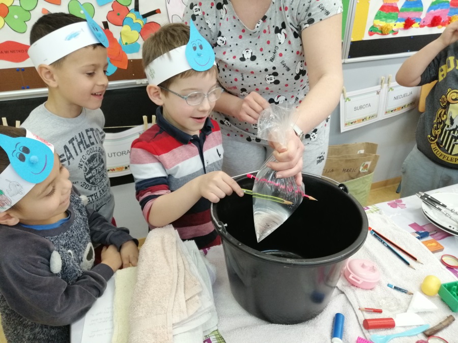 Najprije smo se okušali u natjecateljskoj igri na temu: Životinje koje žive u vodi, a zatim smo čitali slikovnicu „Pismo iz Zelengrada“. Bavili smo se raznim pokusima od kojih su najviše oduševljenja izazvali pokusi: „Lava lampa u čaši“ te „Olovka probada vrećicu punu vode“. Aktivnosti smo nastavili u sportskoj dvorani gdje smo odigrali štafetne igre s plastičnim bocama napunjenima vodom. Po završetku sportskih aktivnosti, tražili smo skriveno blago u ledu. Cijelog dana na glavama smo nosili kapice, ukrašene morskim životinjama s kapljicom vode na vrhu, koje smo dan ranije izradili kroz likovnu aktivnost.