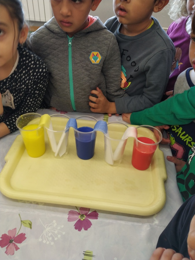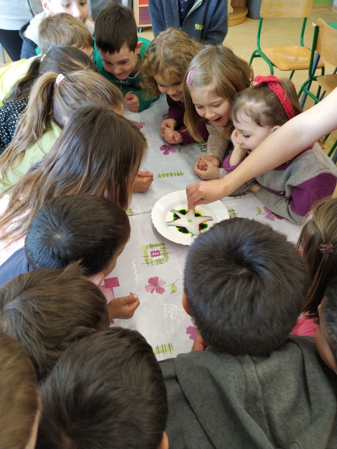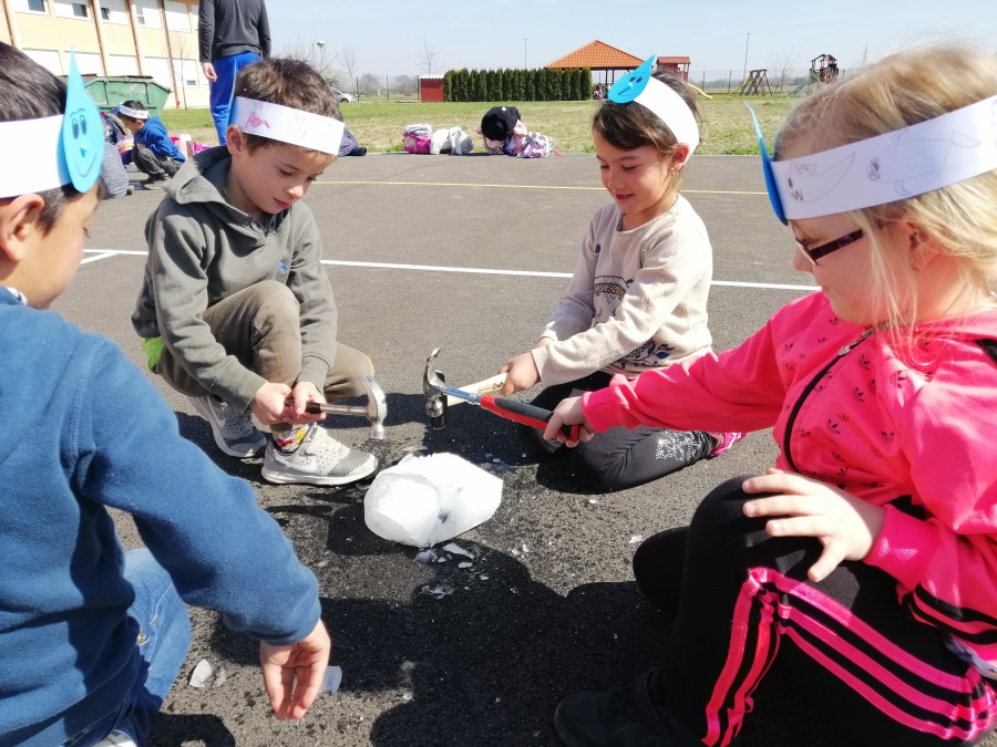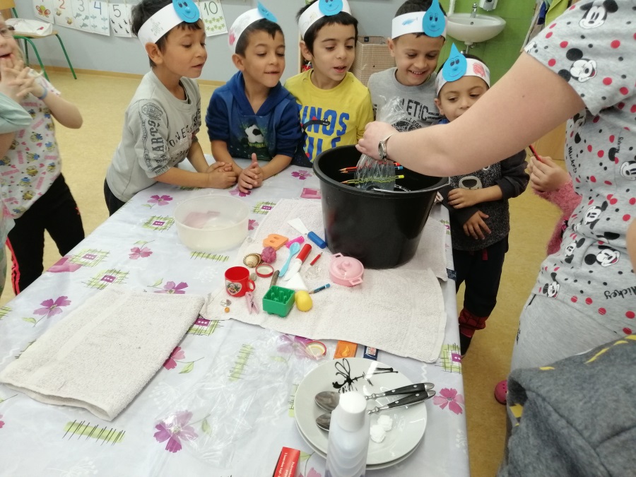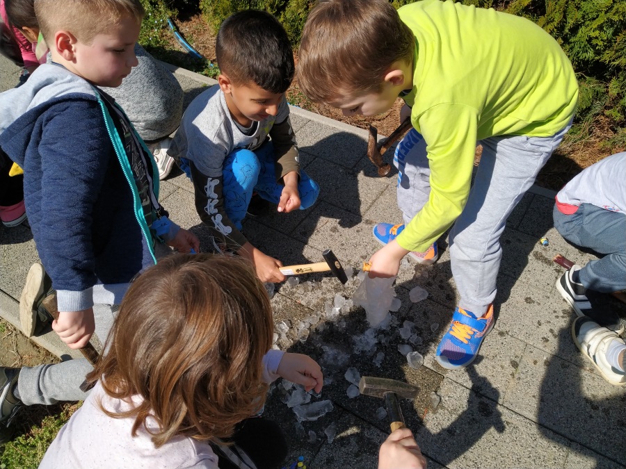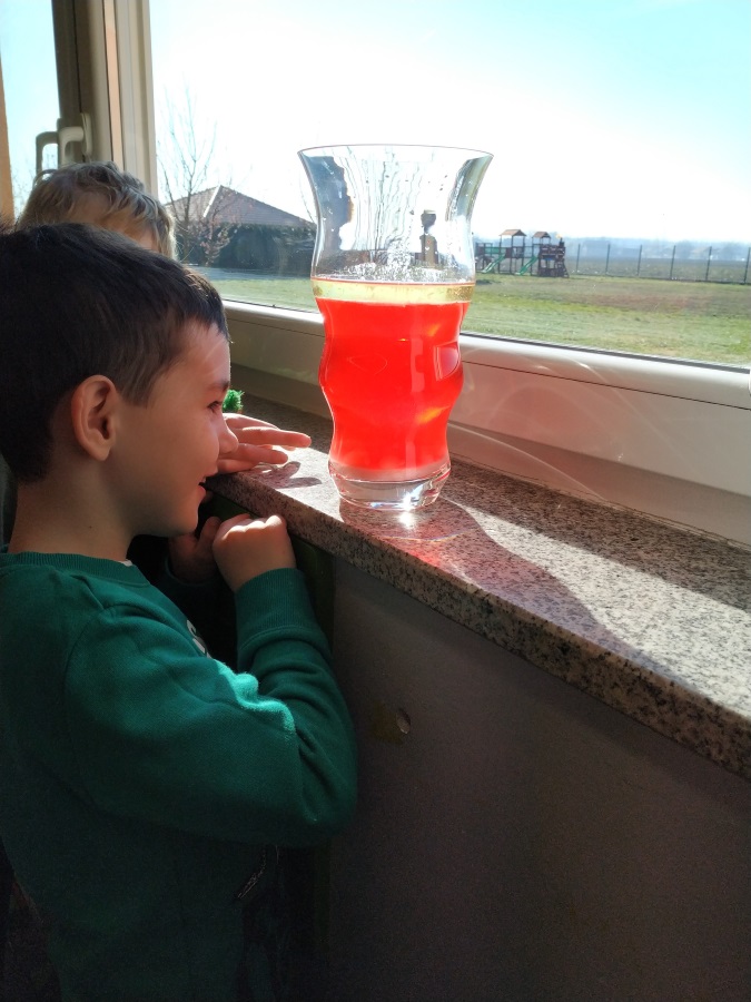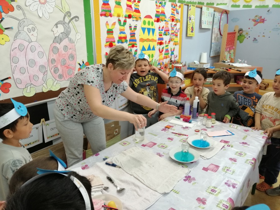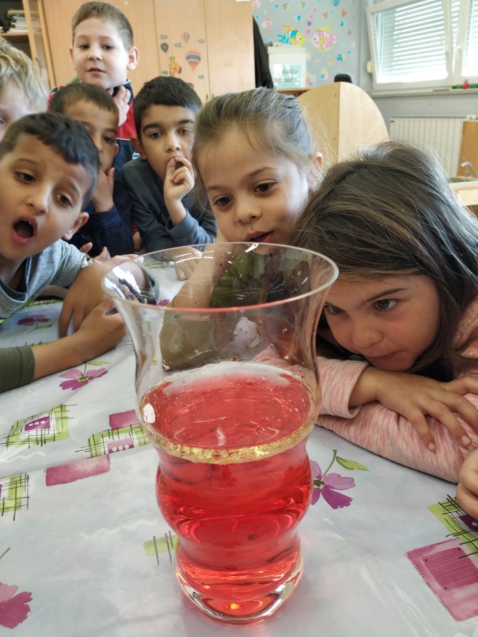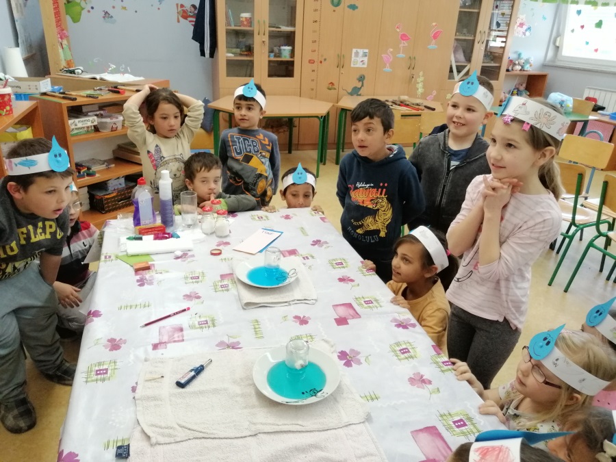 Dan smo započeli raznim pokusima. Najprije smo dokazali da voda može „hodati“, zatim da voda ima kapilarni učinak i da papar u vodi „bježi“ kad ga se dotakne deterđentom. Najviše nas je oduševila lava lampa koju smo izradili od vode, ulja i soli. Nakon pokusa slikali smo ledom i tražili skriveno blago u ledu.