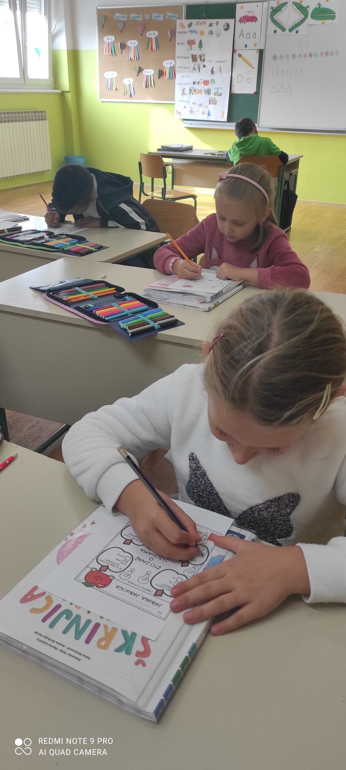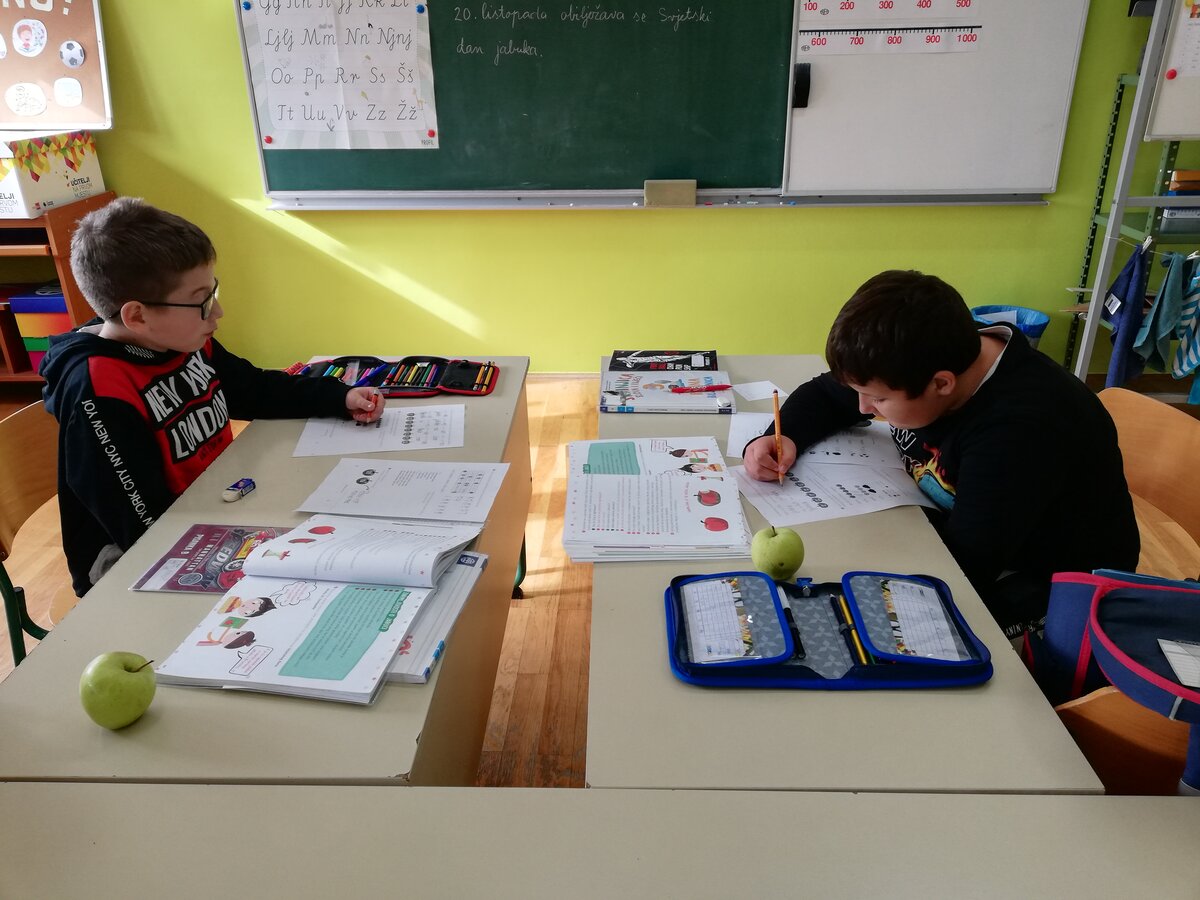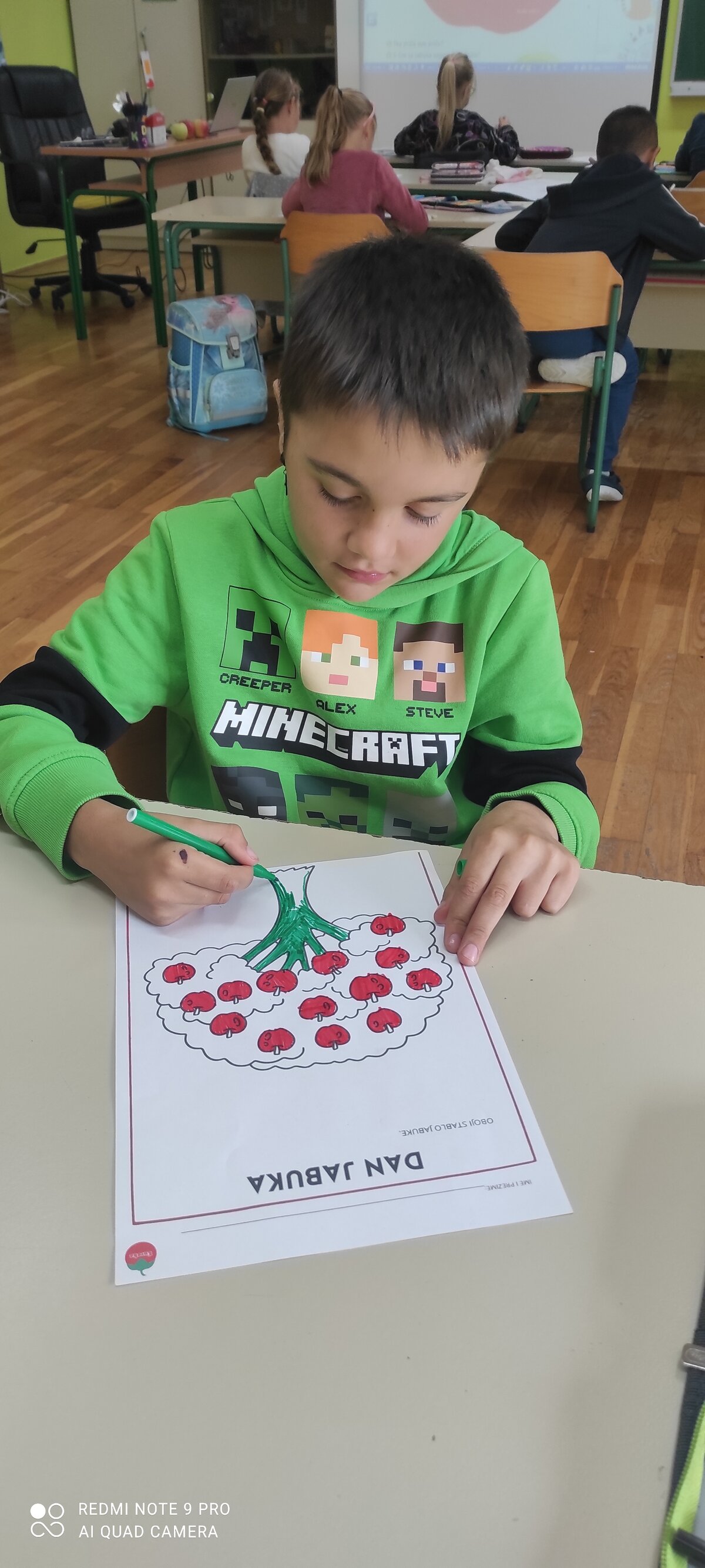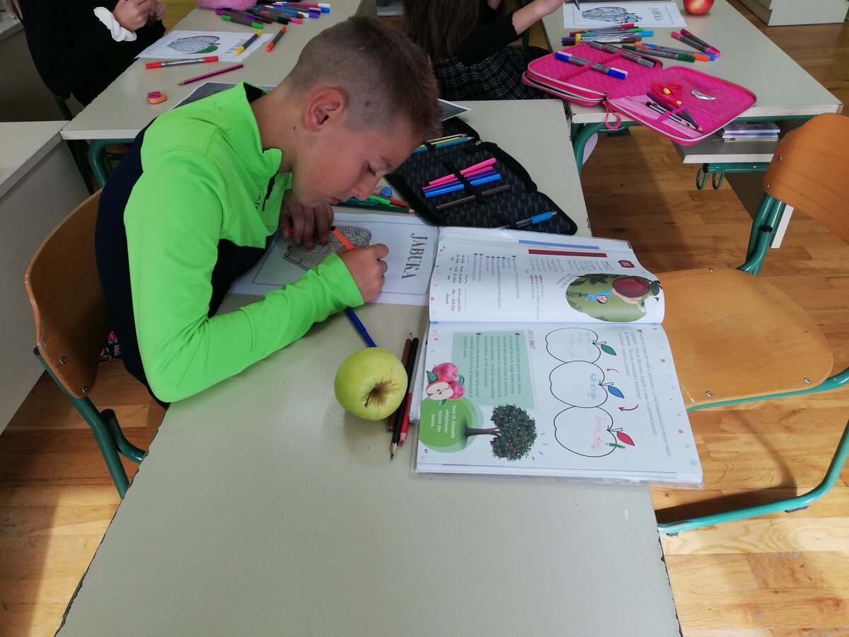 Tom prilikom učenici 1.c/2.d su istražili i saznali zašto je jabuka kraljica voća, koje su najpoznatije sorte jabuka,čitali su priču o jabuci te naslikali jabuke kolaž tehnikom. Učenici 3. c čitali su igrokaz Muke zbog jabuke u kojem djevojčica Ivana ima mnogo muka zbog pisanja sastavka o jabukama. Dobili su zadatak napisati sastavak o jabukama prema slici. Nakon toga rješavali su matematičke zadatke o jabukama. Učenici 4.c čitali su pjesmu o jabukama. Pročitali su i zanimljivost o jednom stablu jabuke na kojem raste 120 sorti jabuka i 20 sorti krušaka te dobili zadatak istražiti kako je to moguće. Rješavali su listić sa stablom jabuke gdje su morali odrediti rod imenica te su bojali mandalu jabuke. Za kraj smo se svi počastili finim slatkim jabukama. Zaključili smo da su jabuke jako dobre za zdravlje i da ih treba često jesti jer sadrže puno vitamina i minerala.